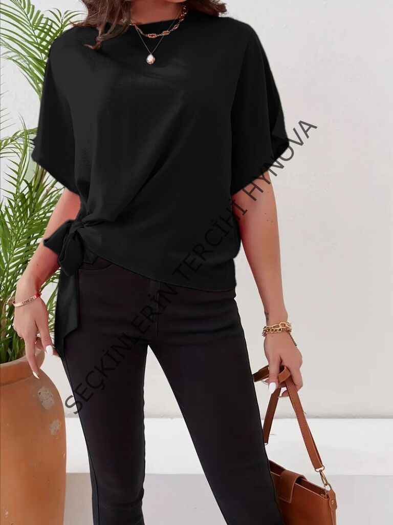 Kadın Kısa Kollu Bisiklet Yaka Yandan Bağlamalı Aerobin Bluz