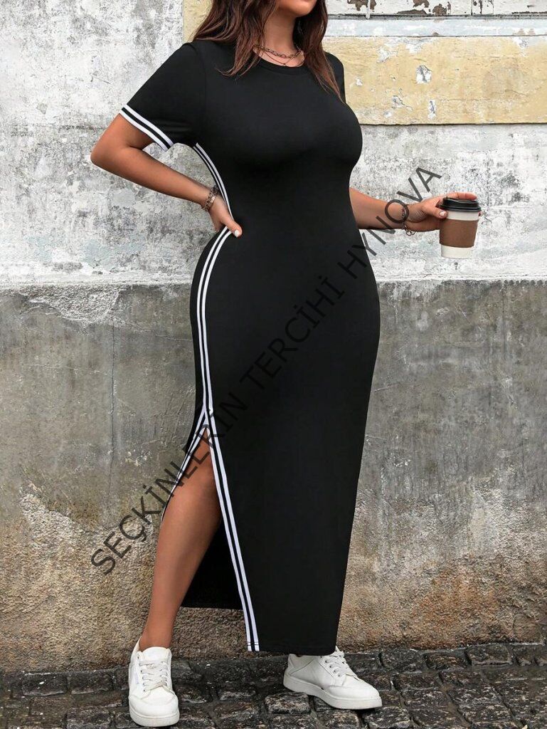 Kadın Kısa Kollu Bisiklet Yaka Yandan şerit Ve Yırtmaçlı Viskon Iki Iplik Elbise