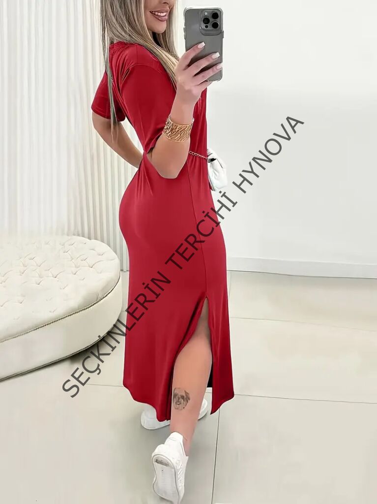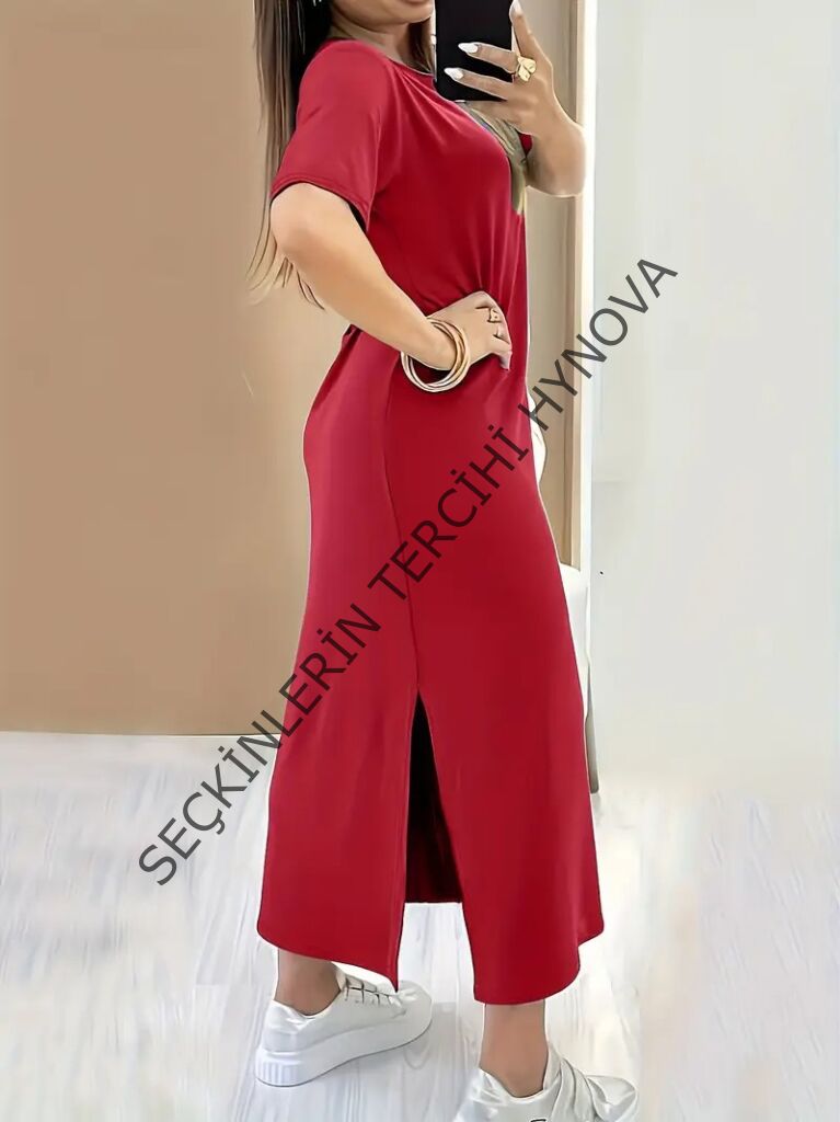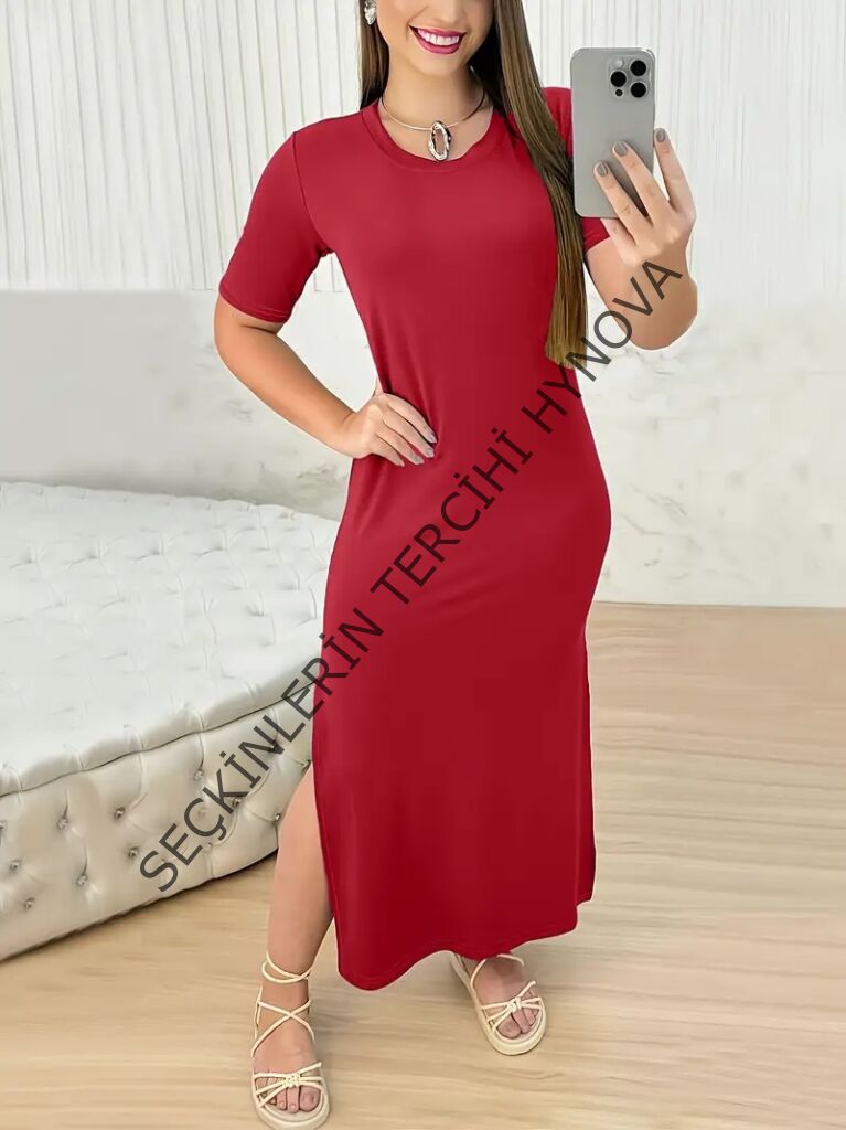 Kadın Kısa Kollu Bisiklet Yaka Yandan Yırtmaçlı Viskon Elbise