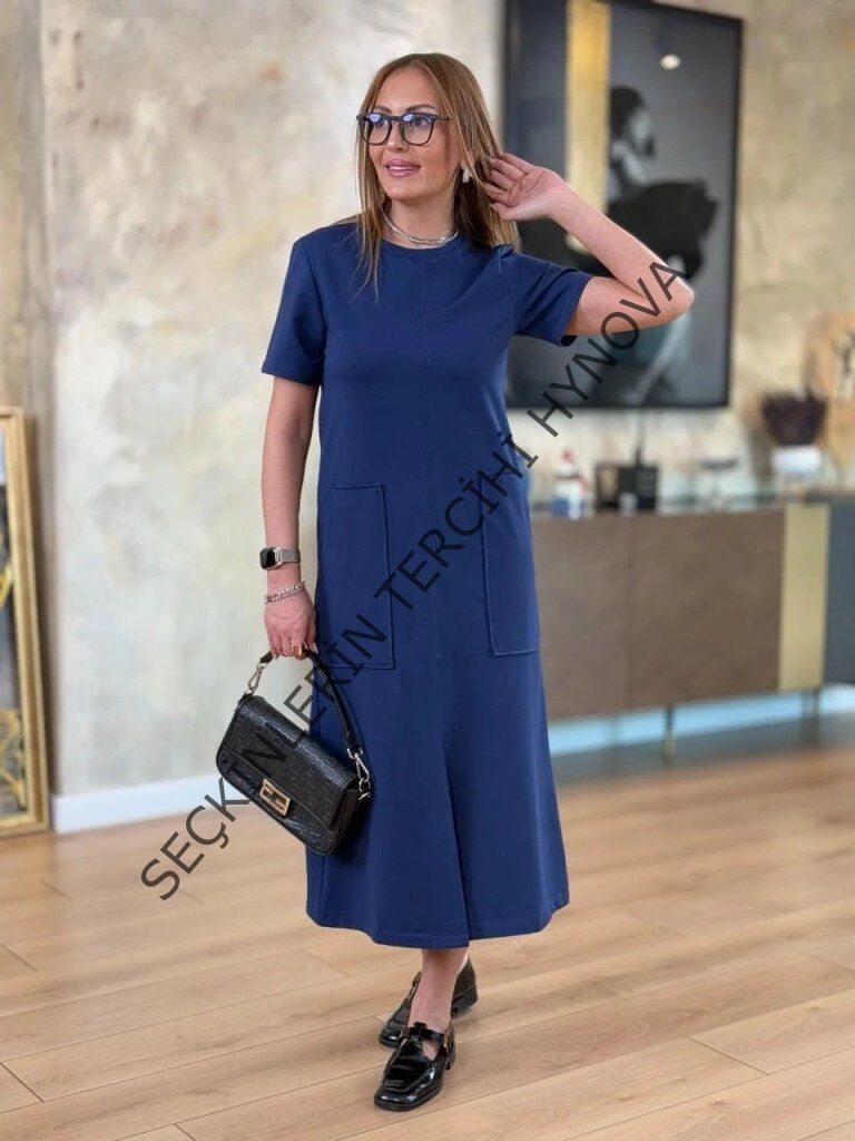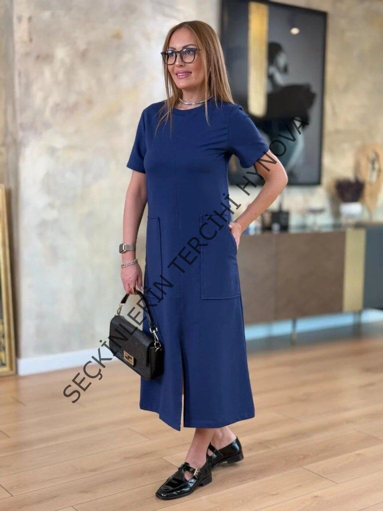 Kadın Kısa Kollu Bisiklet Yakalı Cepli önden Yırtmaçlı Viskon Iki Iplik Midi Elbise