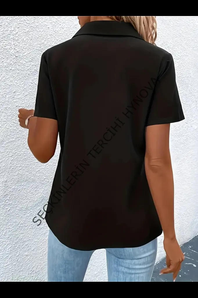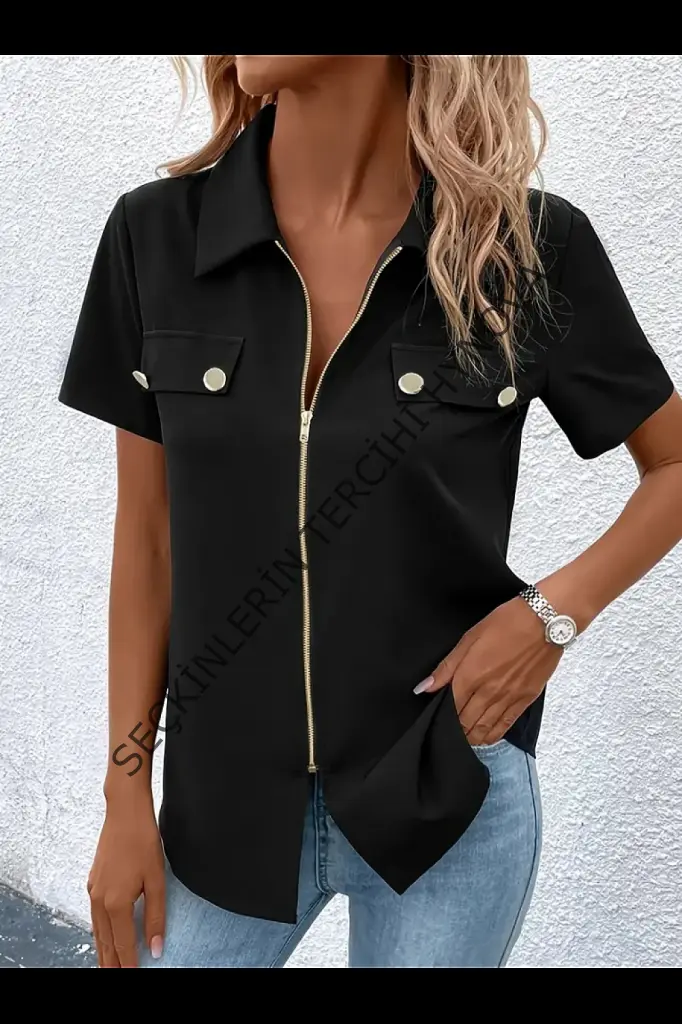 Kadın Kısa Kollu Ceket Yaka önü Fermuarlı Cep Detay Kısa Kol Ithal Krep Bluz