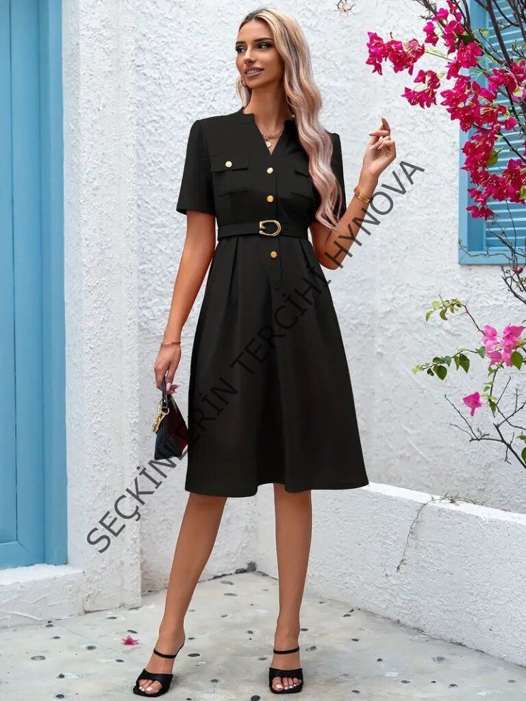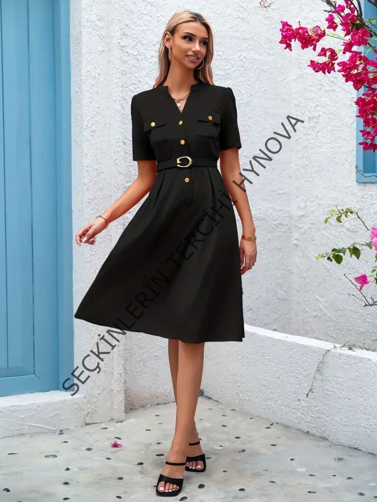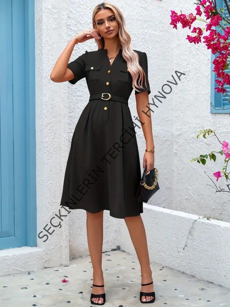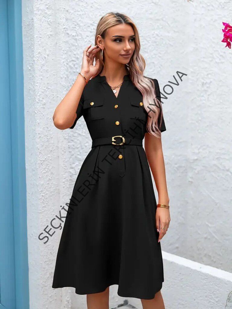 Kadın Kısa Kollu Düğmeli Ve Kemerli Atlas Elbise