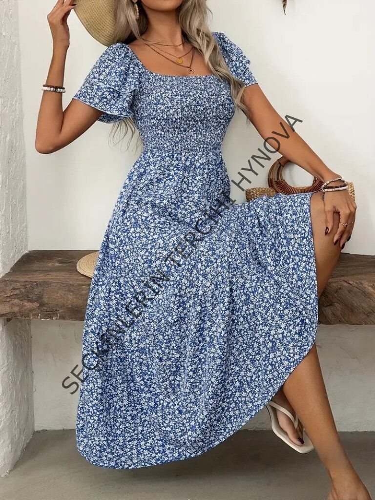 Kadın Kısa Kollu Gipe Detaylı Desenli Midi Süprem Elbise