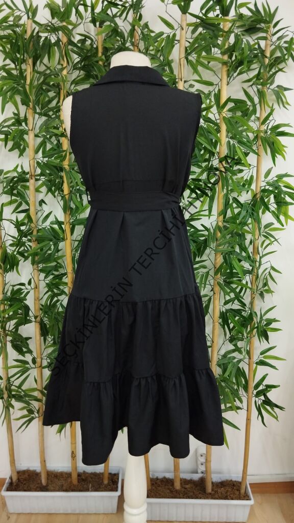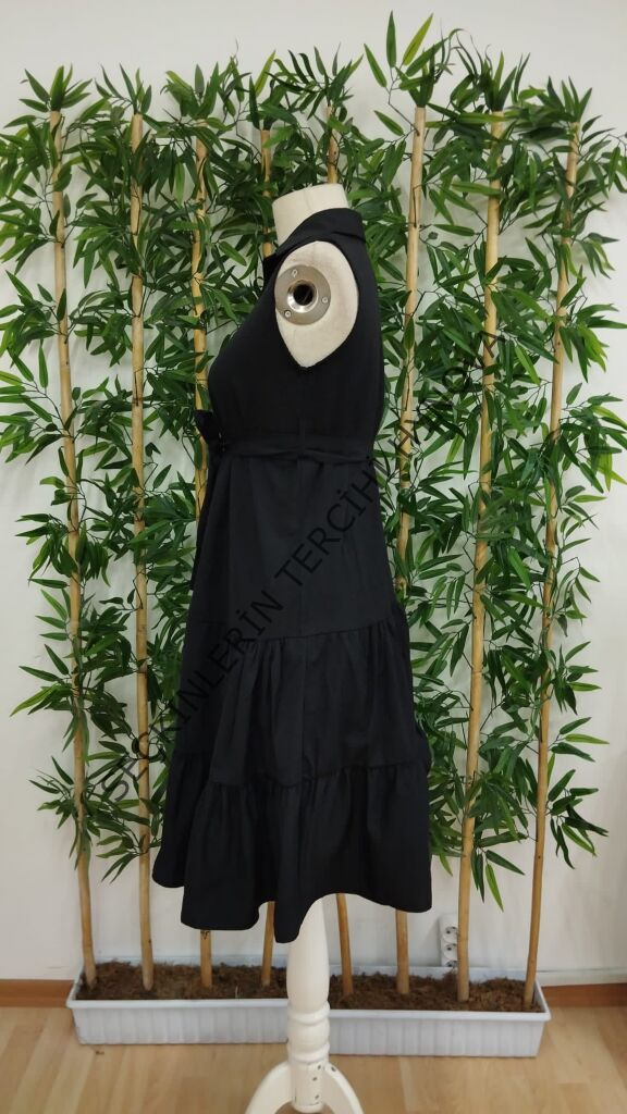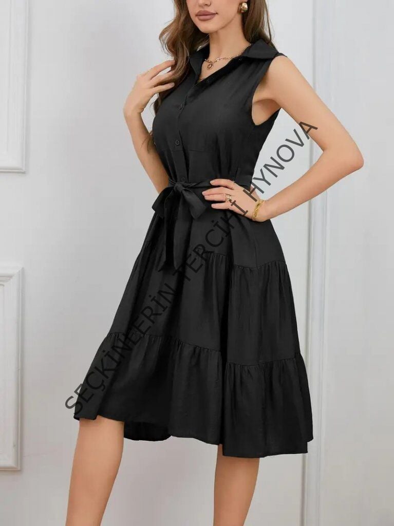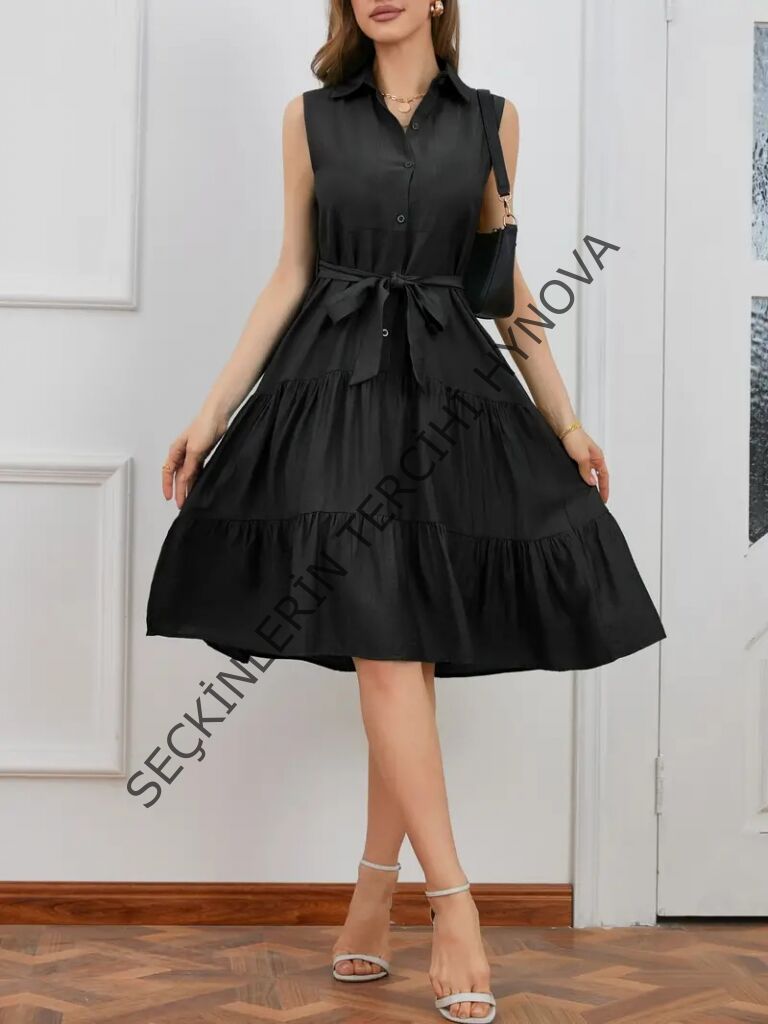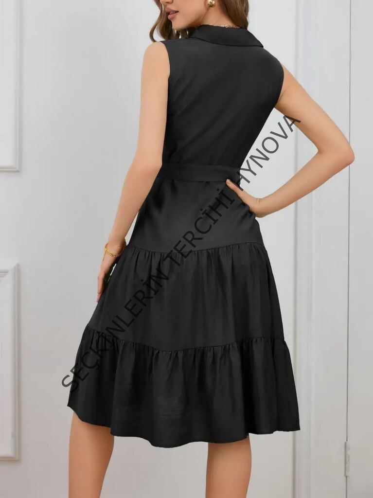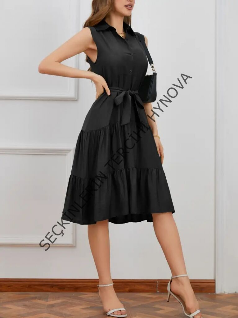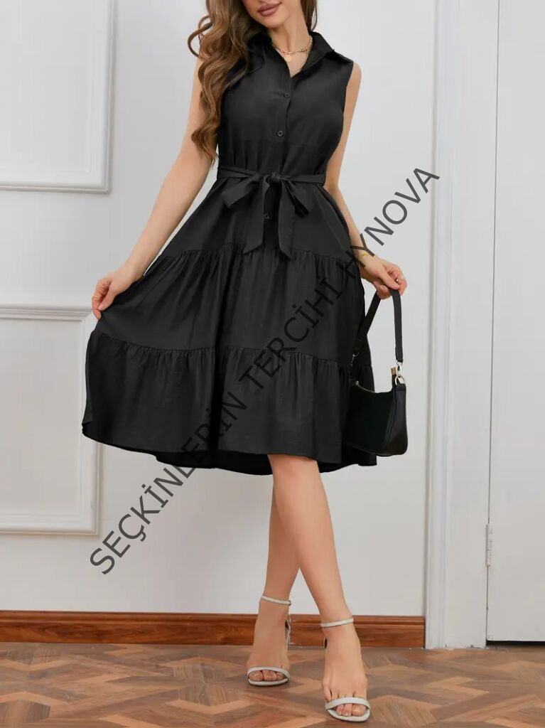 Kadın Kısa Kollu Gömlek Yaka Düğmeli Beli Kuşaklı Katlı Dokuma Midi Elbise