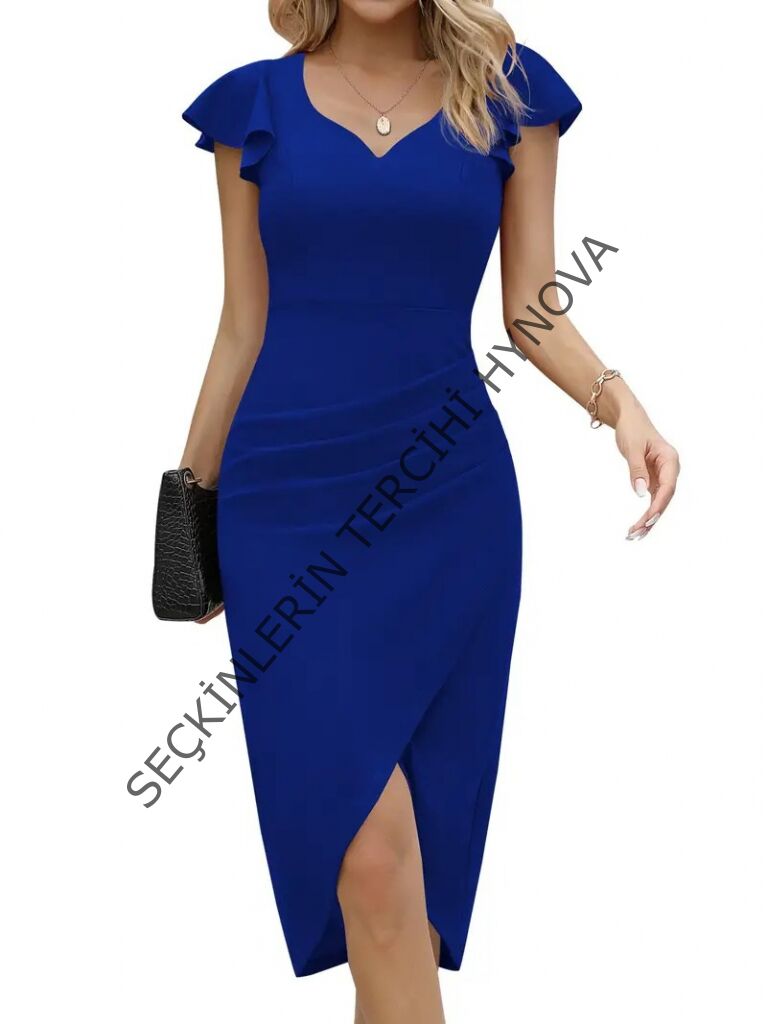 Kadın Kısa Kollu Kalp Yaka Yanlardan Büzgü Detay Midi Janjan Krep Elbise