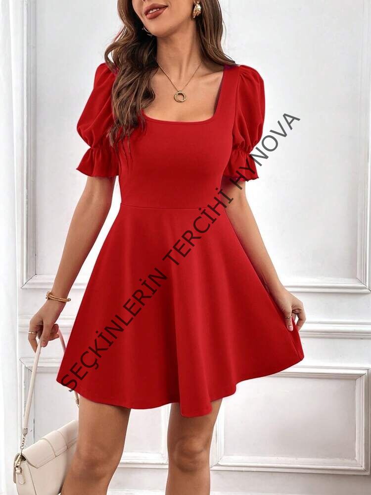 Kadın Kısa Kollu Kare Yakalı Kiloş Ithal Krep Elbise