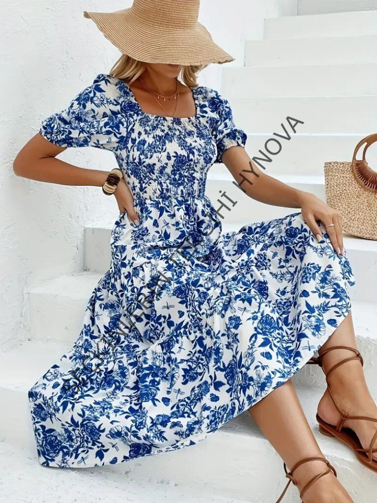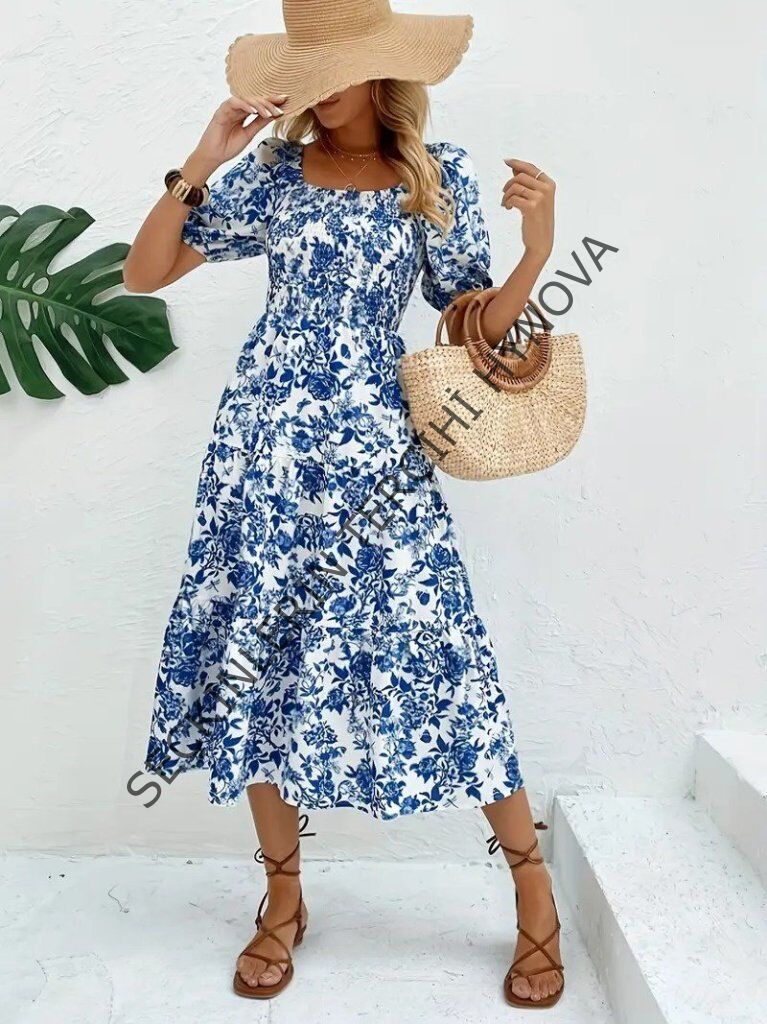 Kadın Kısa Kollu Kare Yakalı Lastikli Desenli Süprem Elbise