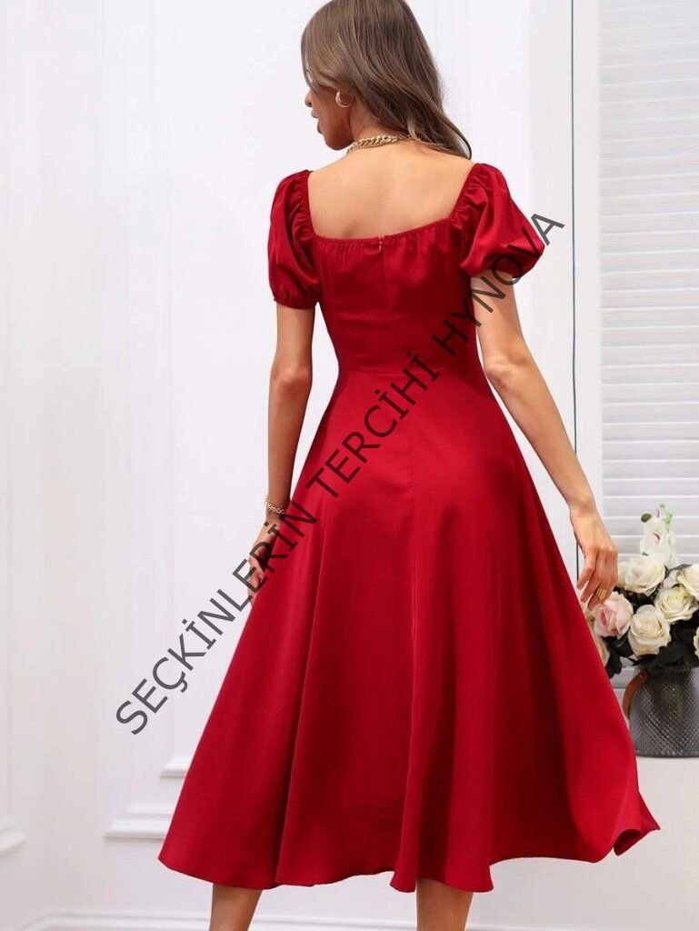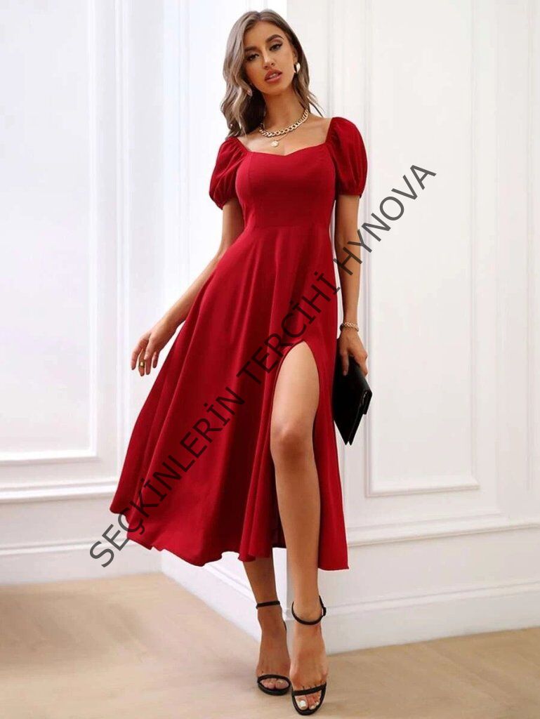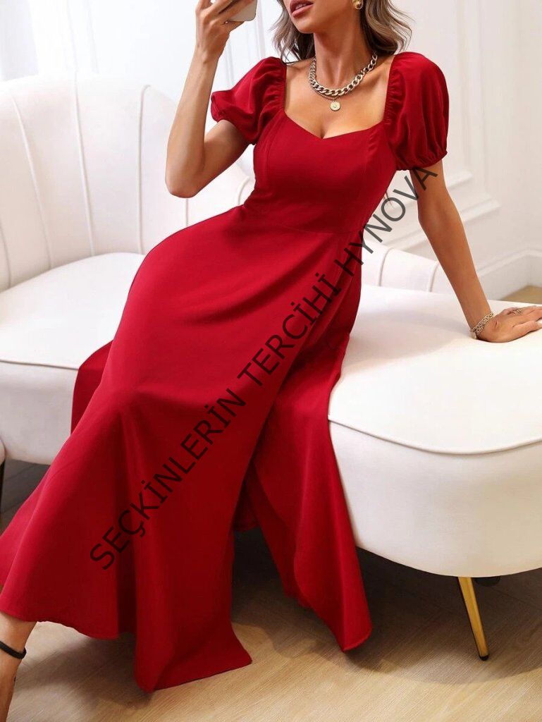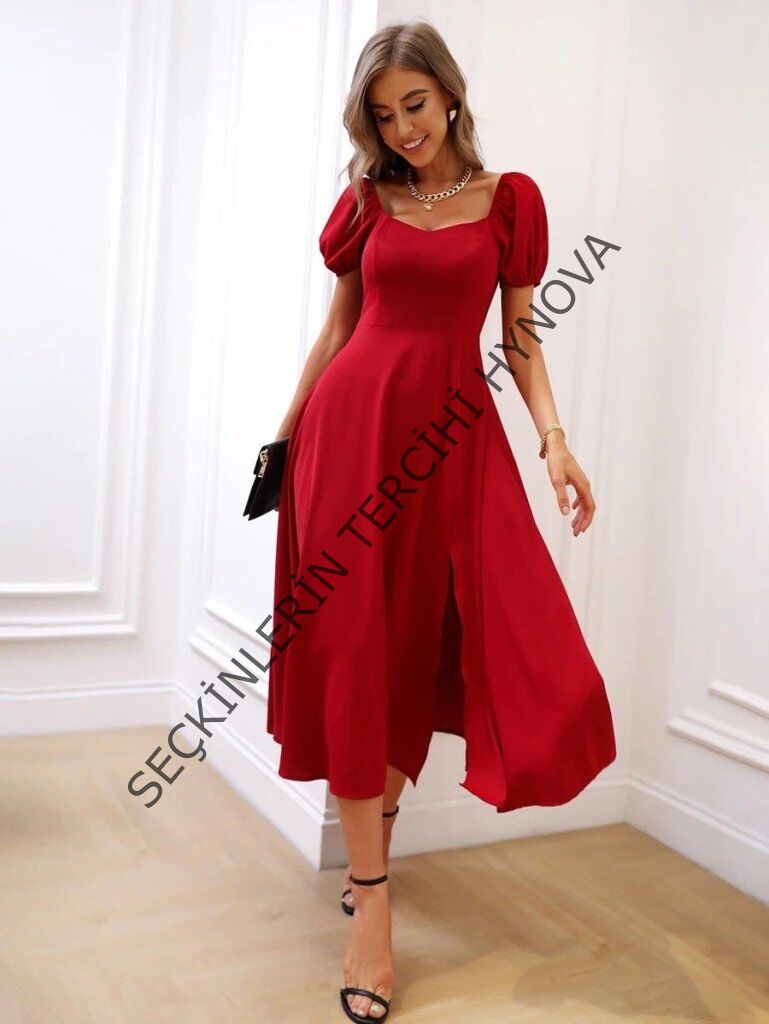 Kadın Kısa Kollu Kare Yakalı Yırtmaçlı Midi Janjan Krep Elbise
