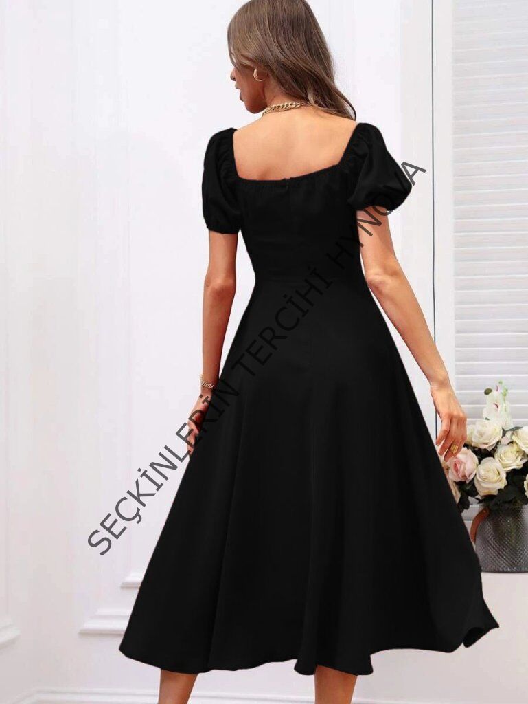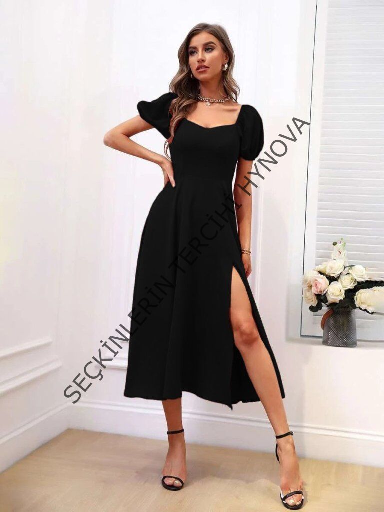 Kadın Kısa Kollu Kare Yakalı Yırtmaçlı Midi Janjan Krep Elbise