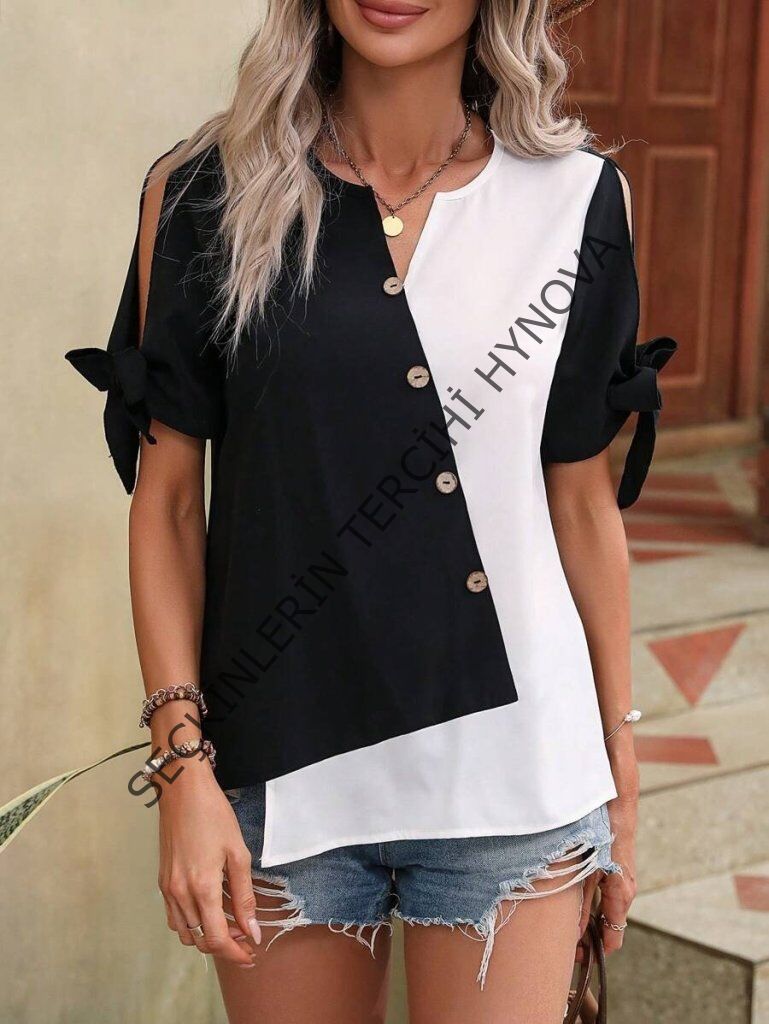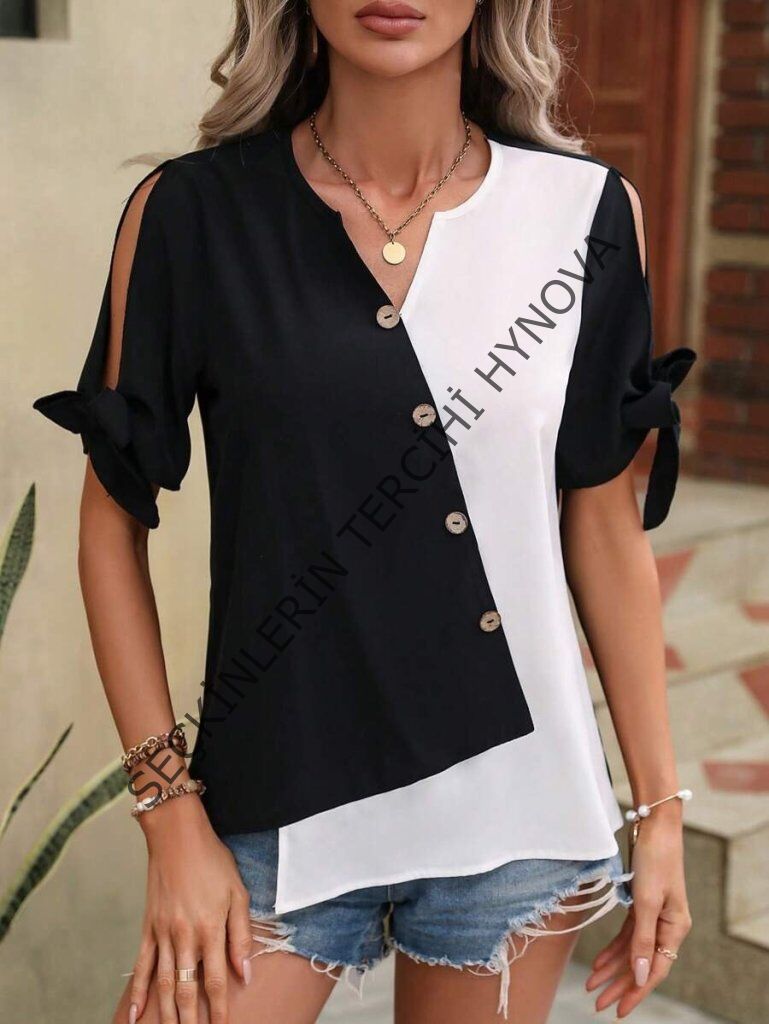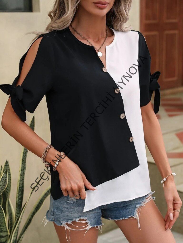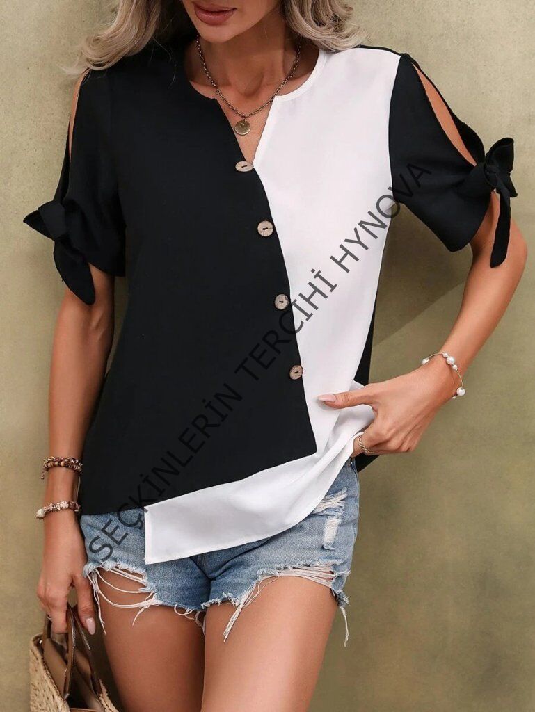 Kadın Kısa Kollu Kollardan Bağlamalı önden Asimetrik Kesim çift Renk Detaylı Düğmeli Ithal Krep Bluz