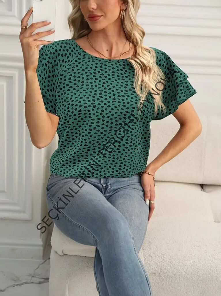 Kadın Kısa Kollu Kolları Volanlı Baskılı Süprem Bluz