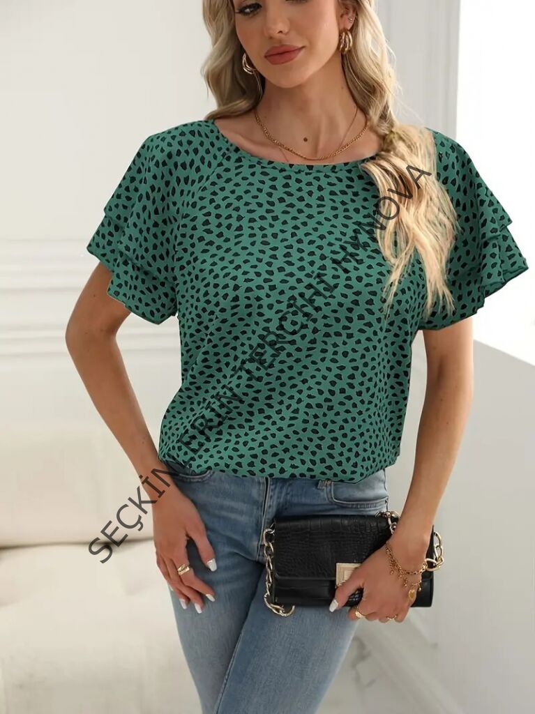 Kadın Kısa Kollu Kolları Volanlı Baskılı Süprem Bluz