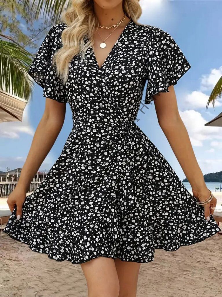 Kadın Kısa Kollu Kolu Ve Eteği Volanlı Fırfırlı çiçek Desenli Mini Elbise