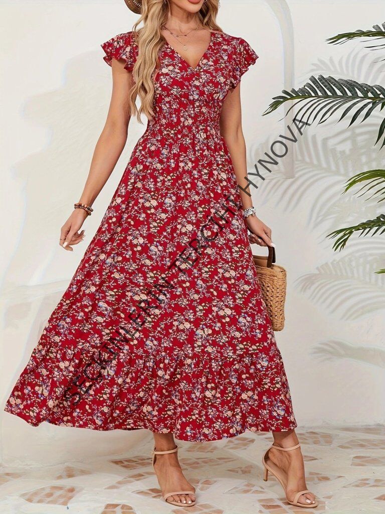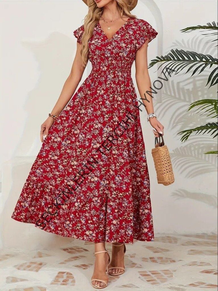 Kadın Kısa Kollu Kruvaze Yaka Beli Lastikli çiçek Desenli Elbise
