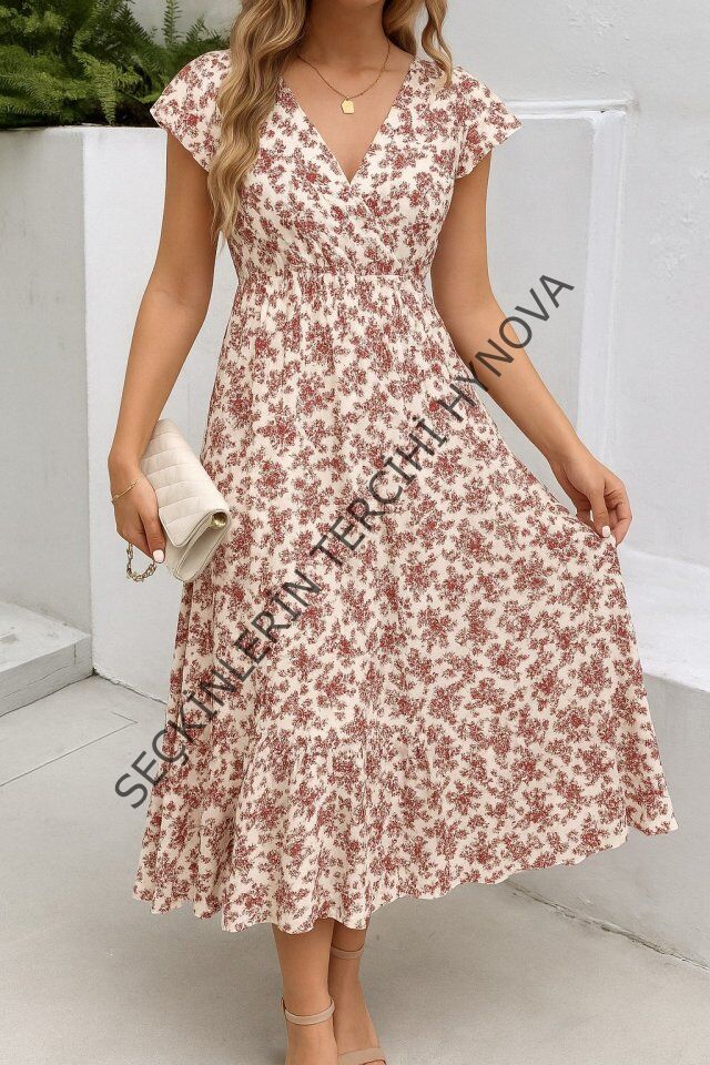 Kadın Kısa Kollu Kruvaze Yaka Beli Lastikli çiçek Desenli Elbise
