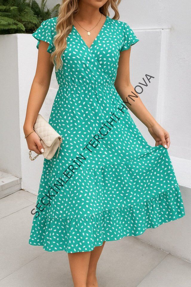 Kadın Kısa Kollu Kruvaze Yaka Beli Lastikli çiçek Desenli Elbise