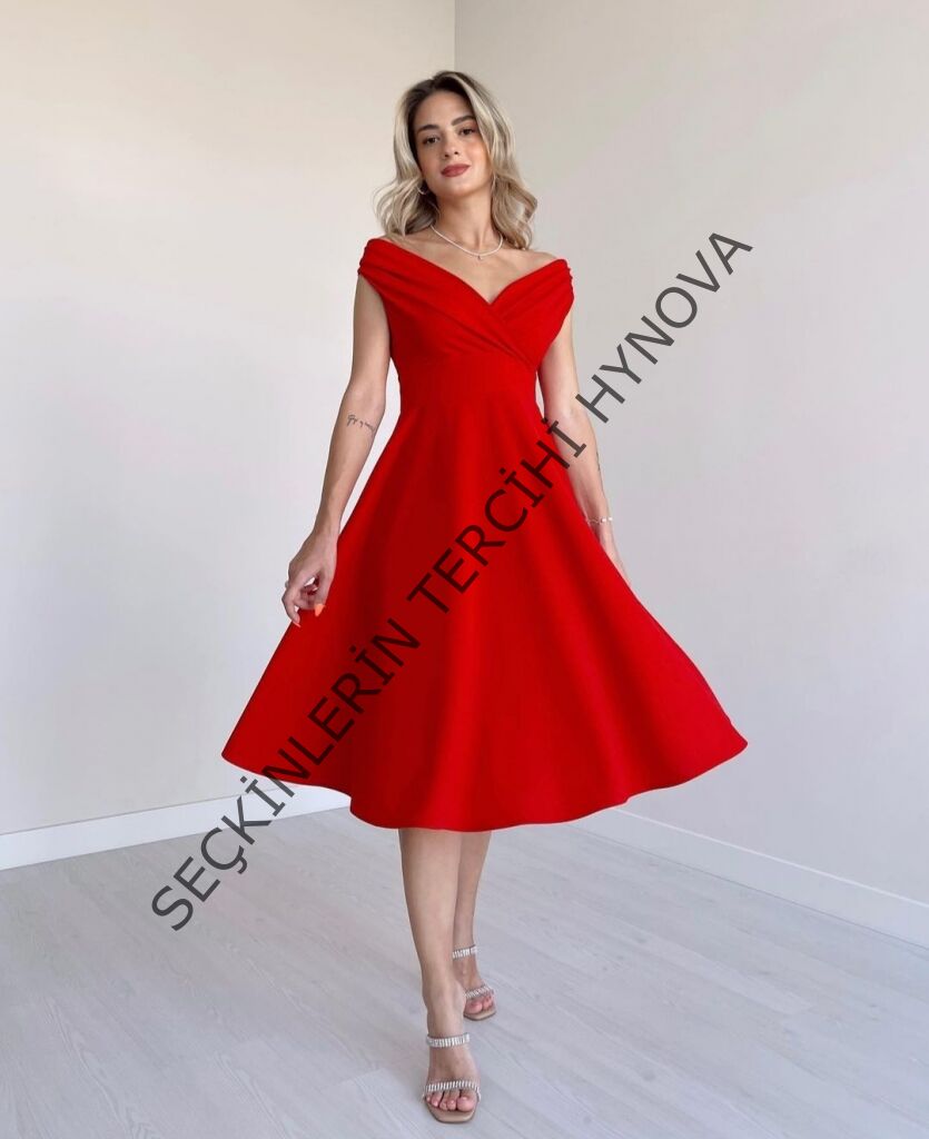 Kadın Kısa Kollu Kruvaze Yaka Eteği Volanlı Krep Elbise
