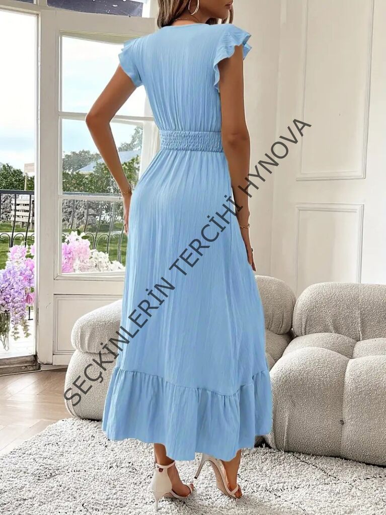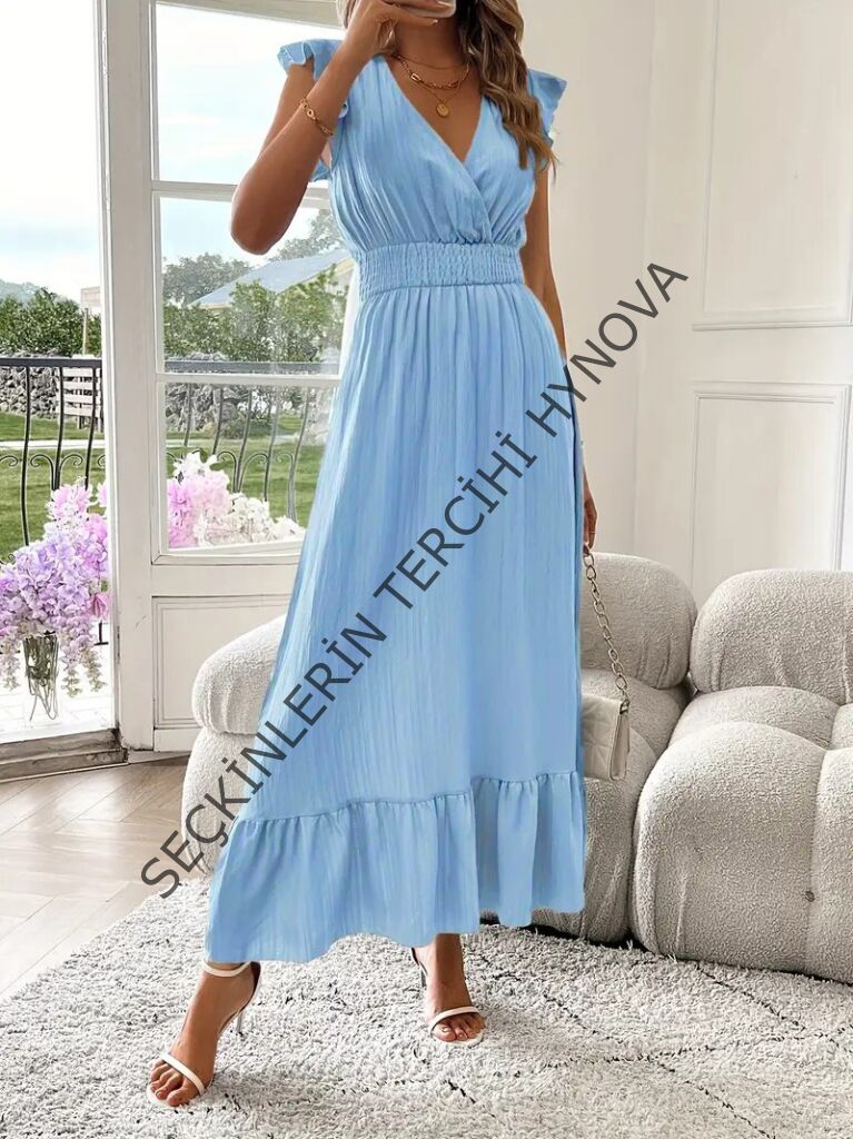 Kadın Kısa Kollu Kruvaze Yakalı Beli Lastikli Müslim Elbise