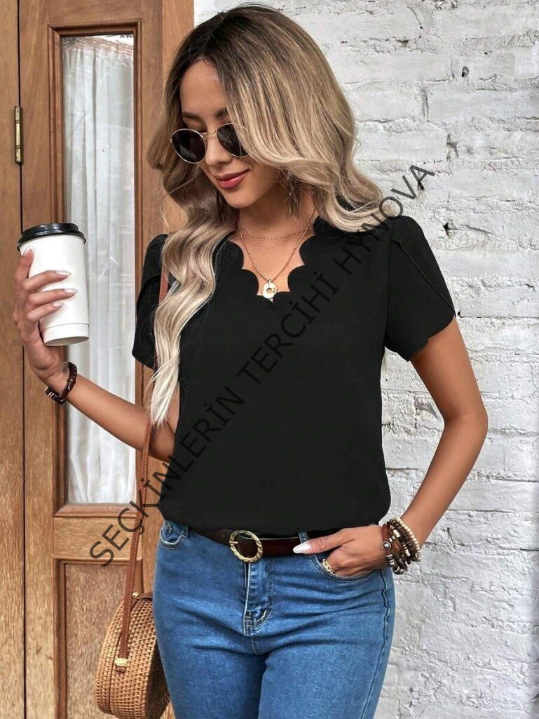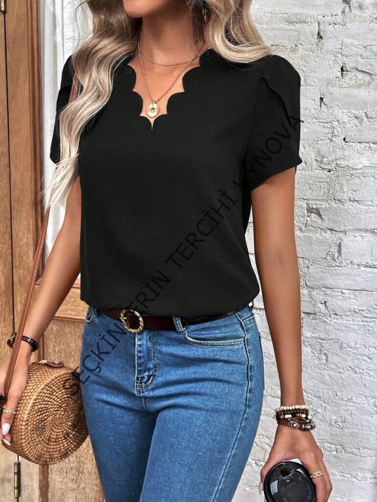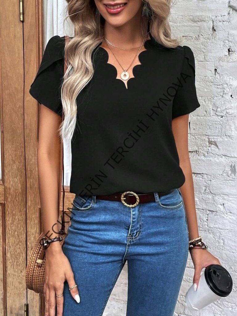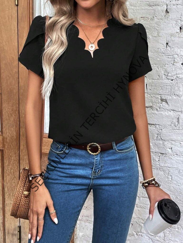 Kadın Kısa Kollu Lazer V Yakalı Ithal Krep Bluz