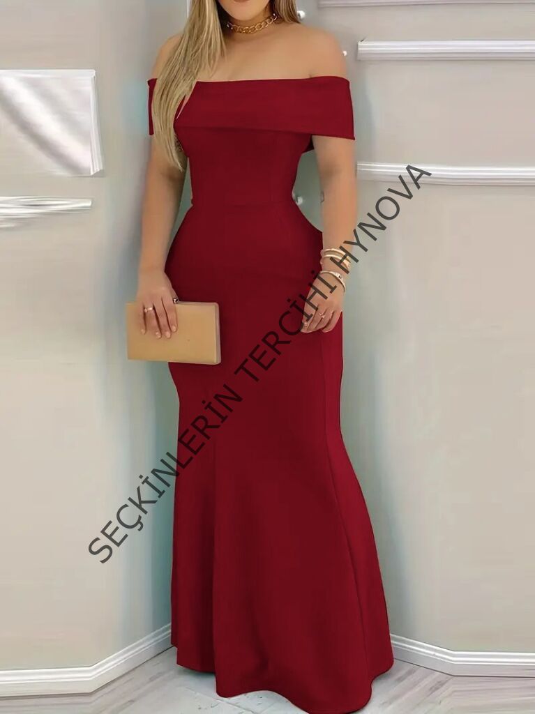 Kadın Kısa Kollu Madonna Yaka Belden Oturtmalı Uzun Ithal Krep Elbise