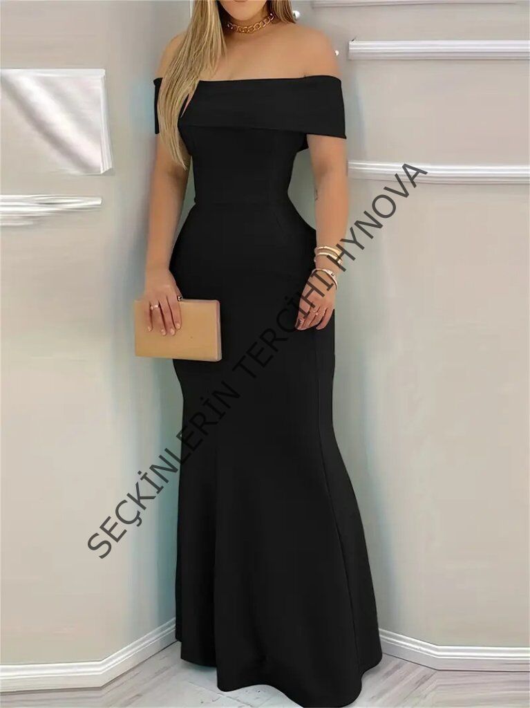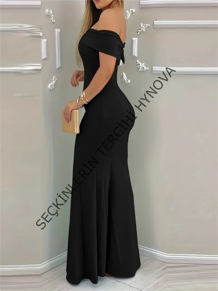 Kadın Kısa Kollu Madonna Yaka Belden Oturtmalı Uzun Ithal Krep Elbise
