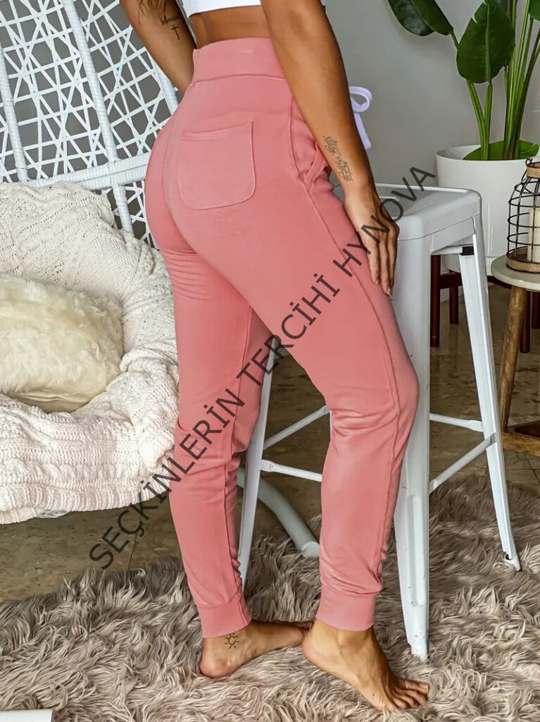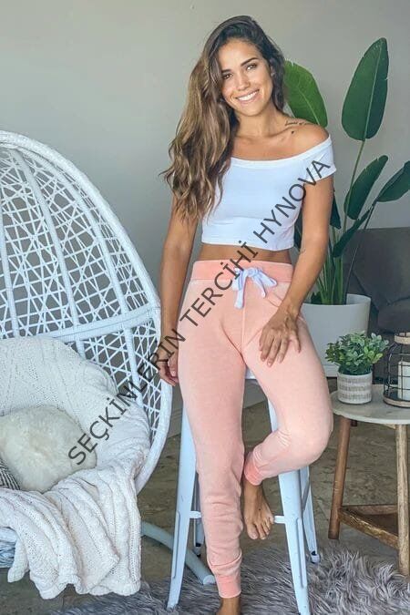 Kadın Kısa Kollu Madonna Yaka Viskon Crop Bluz Cepli Iki Iplik Eşofman Takım