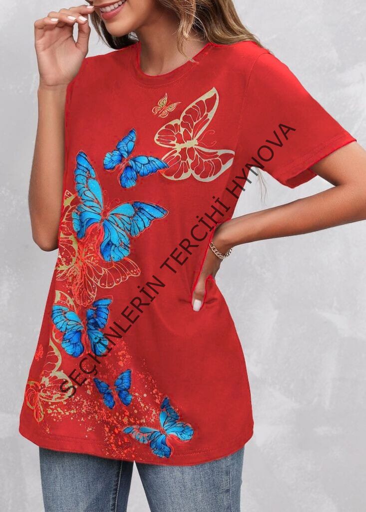 Kadın Kısa Kollu Mavi Sarı Kelebek Baskı Süprem Bluz