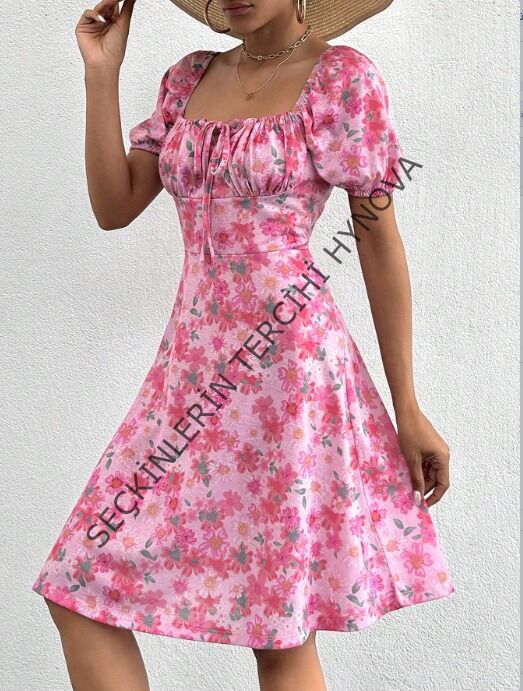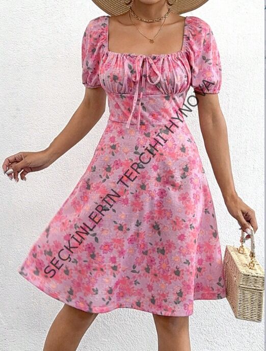 Kadın Kısa Kollu Mini çiçek Baskılı Bağcık Detay Süprem Midi Boy Elbise