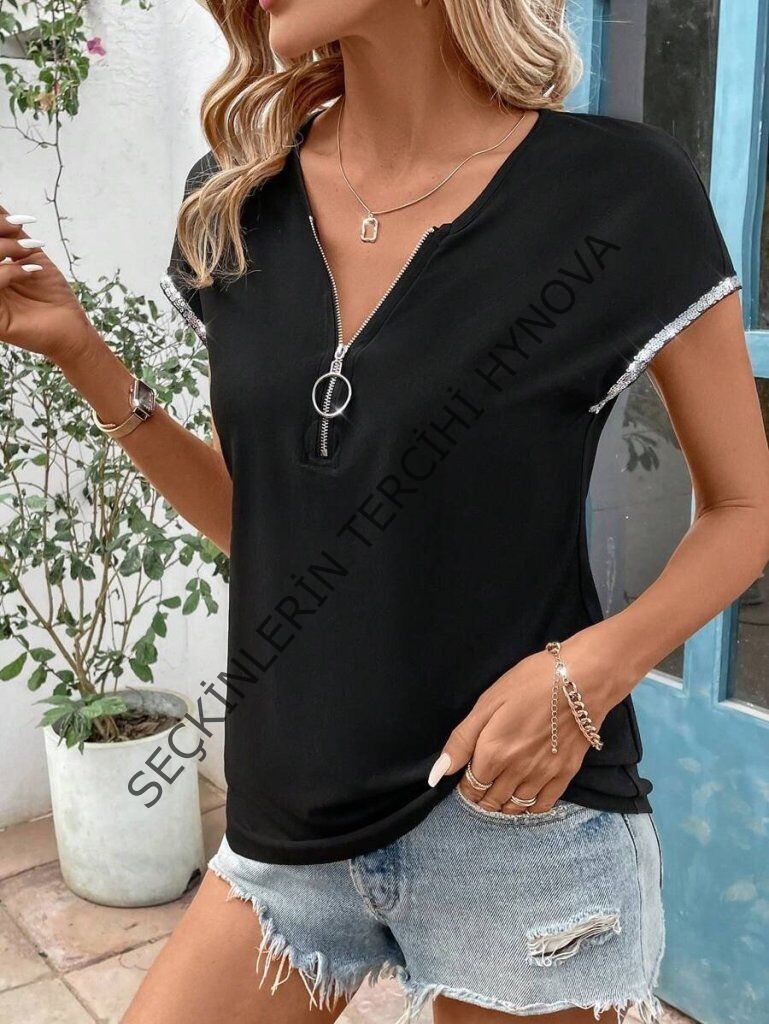 Kadın Kısa Kollu önden Fermuarlı Kol Ucu ışıltılı Viskon Bluz