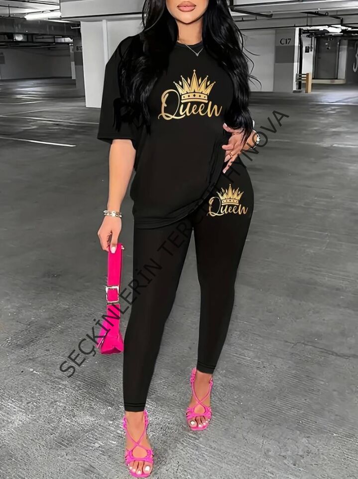Kadın Kısa Kollu Queen Baskı Viskon Ikili Takım