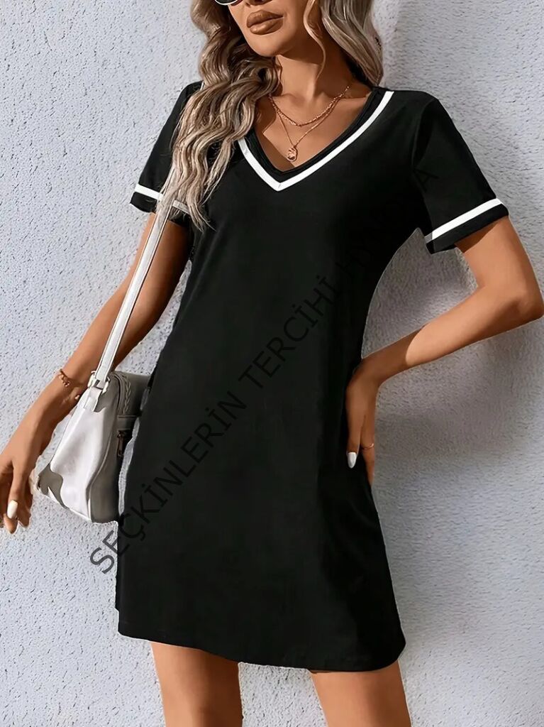 Kadın Kısa Kollu V çizgili Yakalı Kısa Viskon Elbise