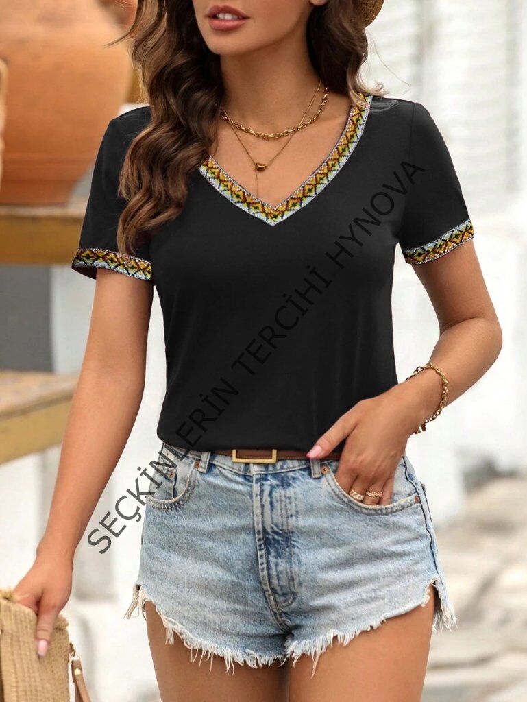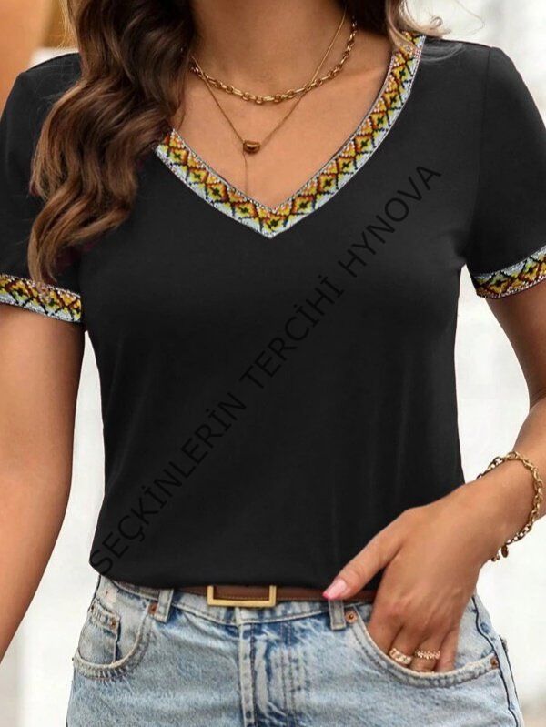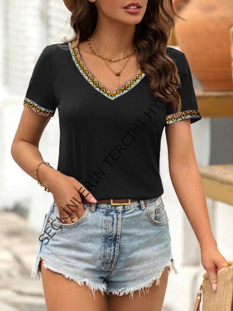 Kadın Kısa Kollu V şerit Etnik Desen Yakalı Viskon Bluz