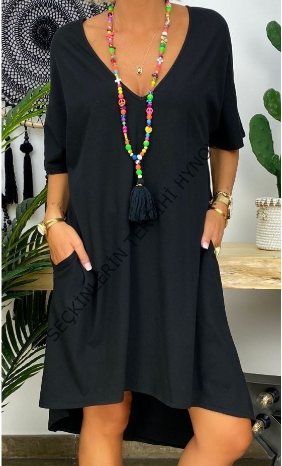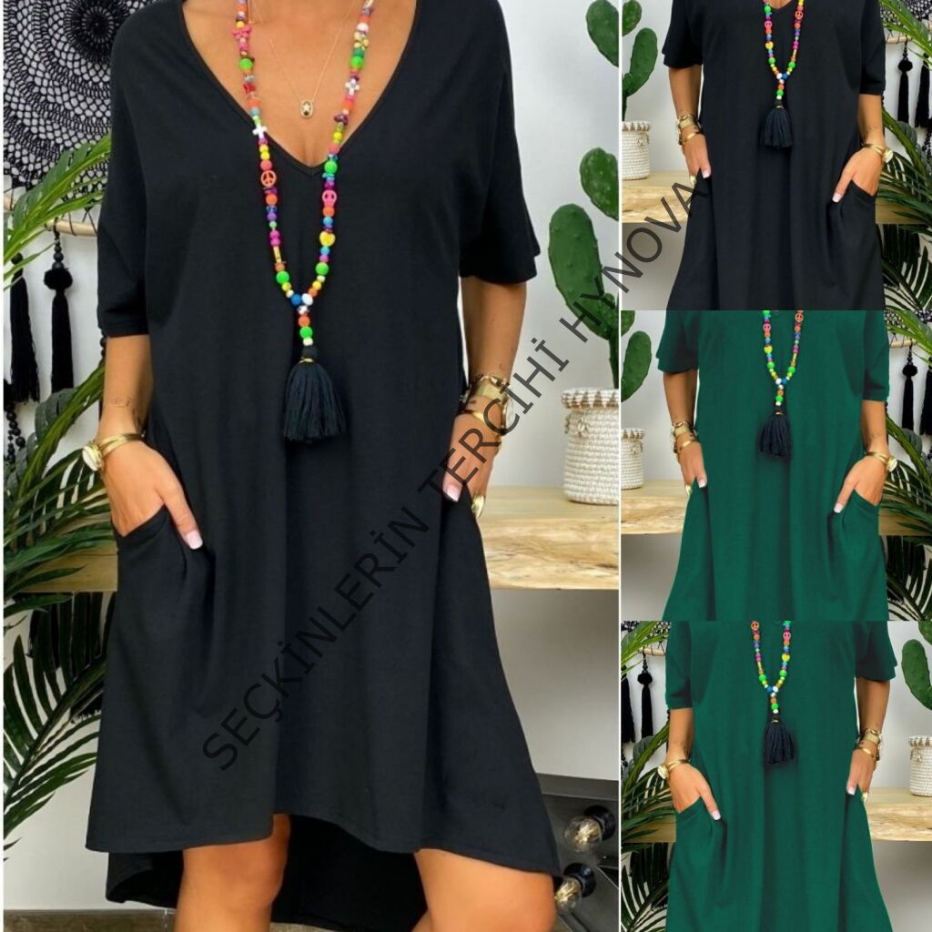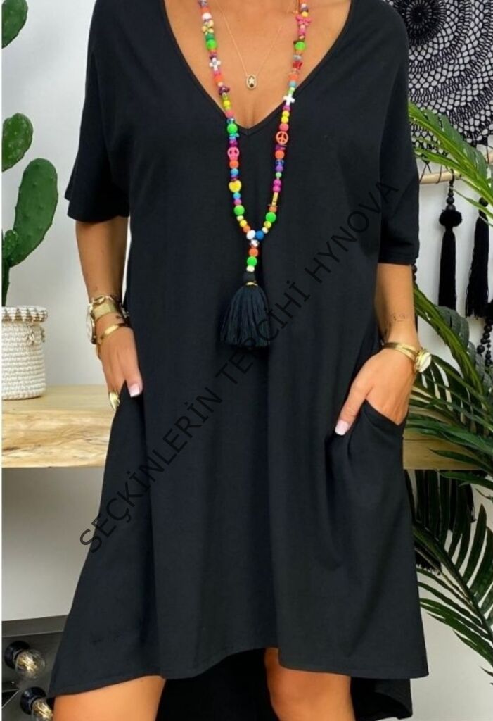 Kadın Kısa Kollu V Yaka Cepli Bürümcük Salaş Elbise