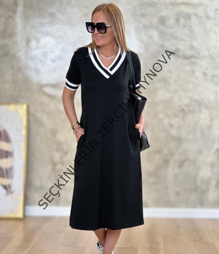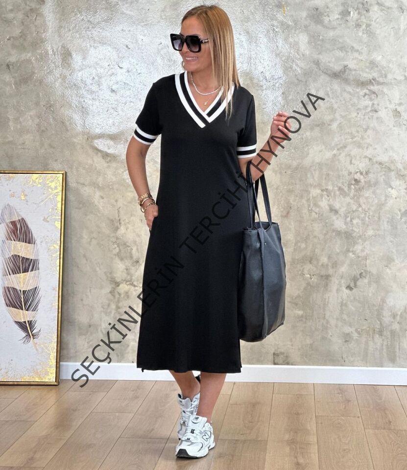 Kadın Kısa Kollu V Yaka Kol Ve Yaka Ribana Detay Midi Boy Viskon Elbise