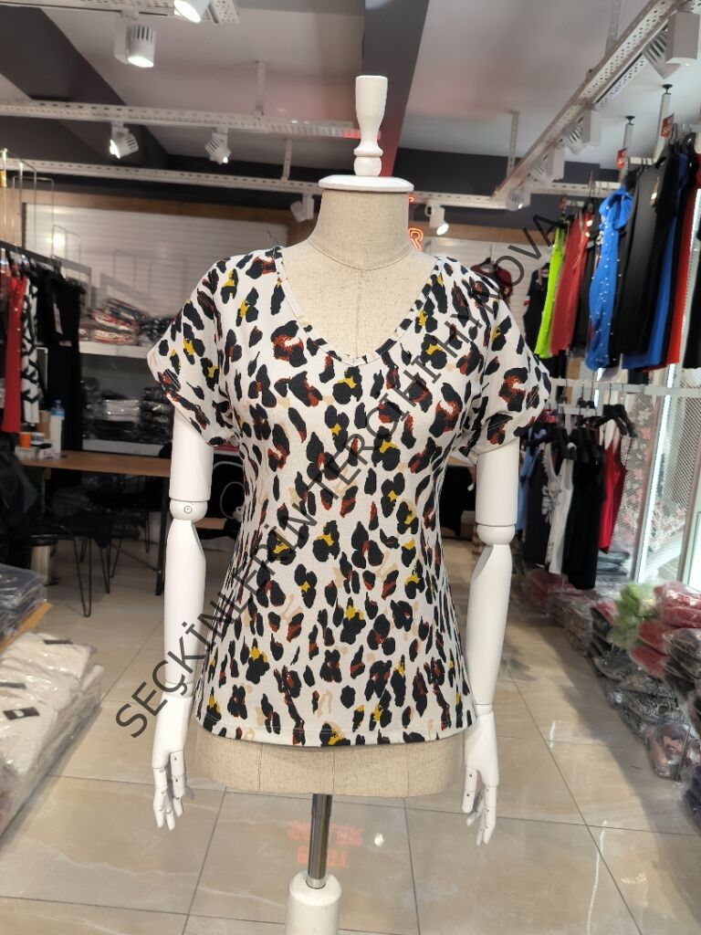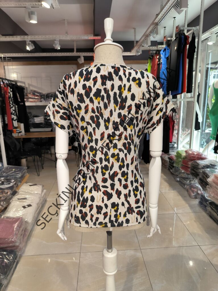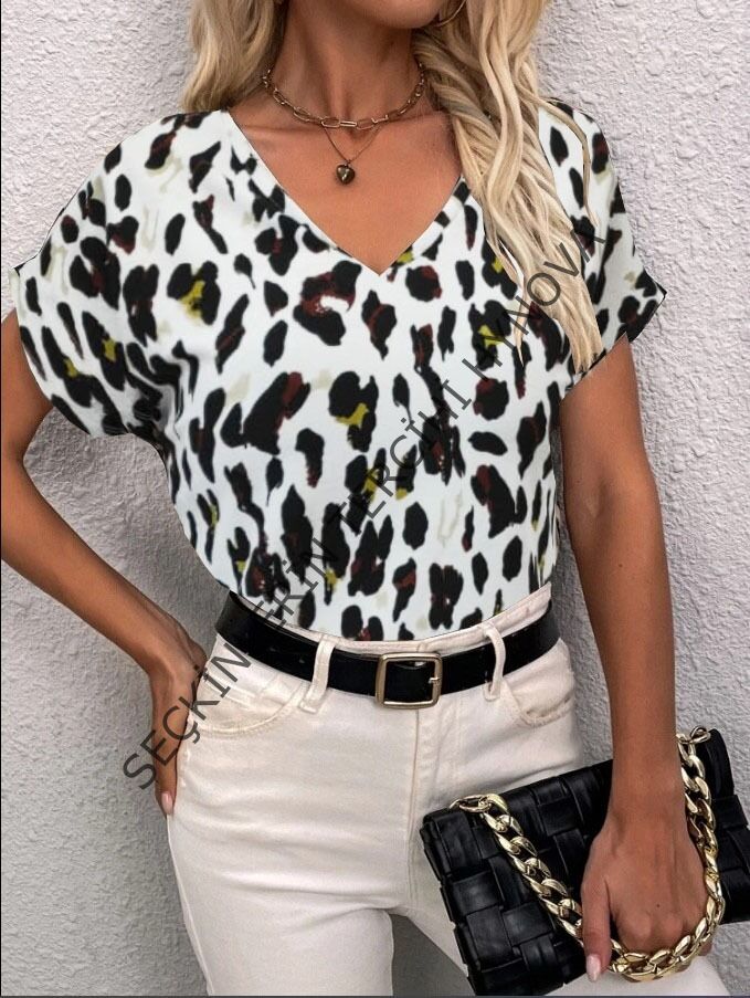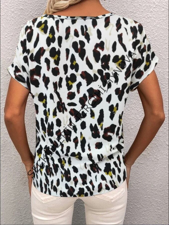 Kadın Kısa Kollu V Yaka Leopar Desen Krep Bluz