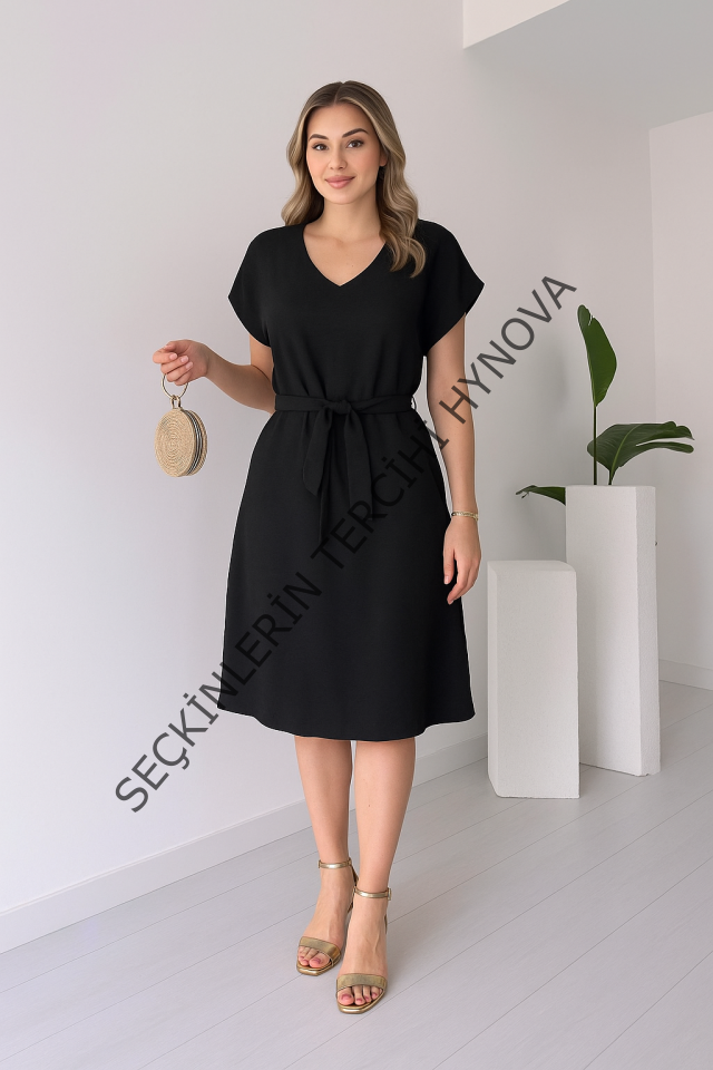 Kadın Kısa Kollu V Yakalı Beli Kuşaklı Ithal Keten Elbise