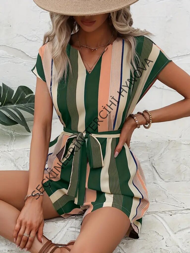 Kadın Kısa Kollu V Yakalı Beli Kuşaklı Keten Tulum