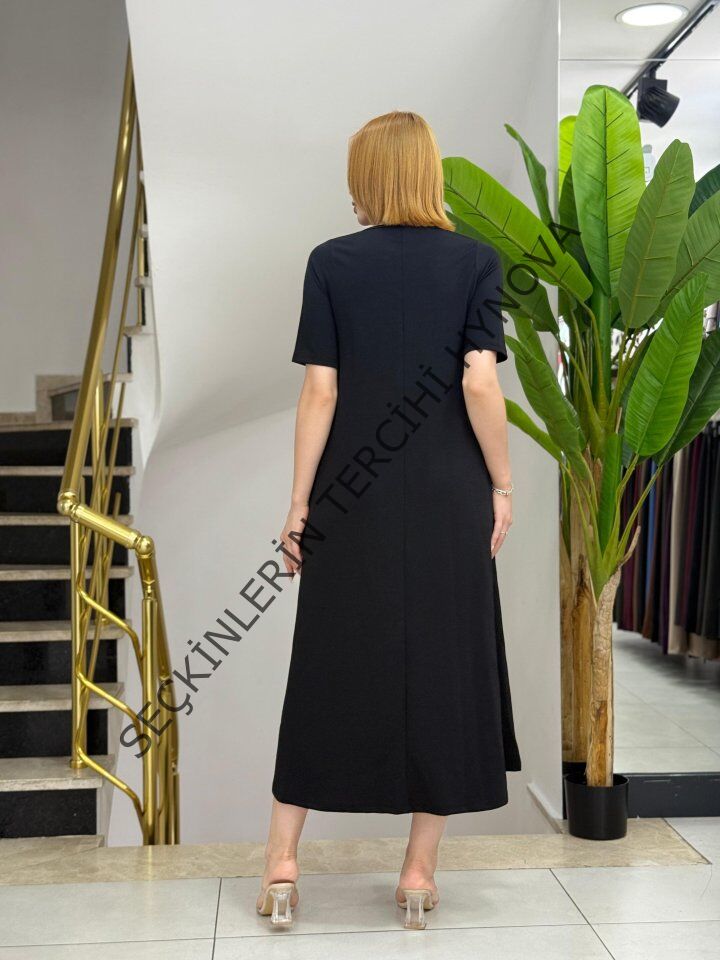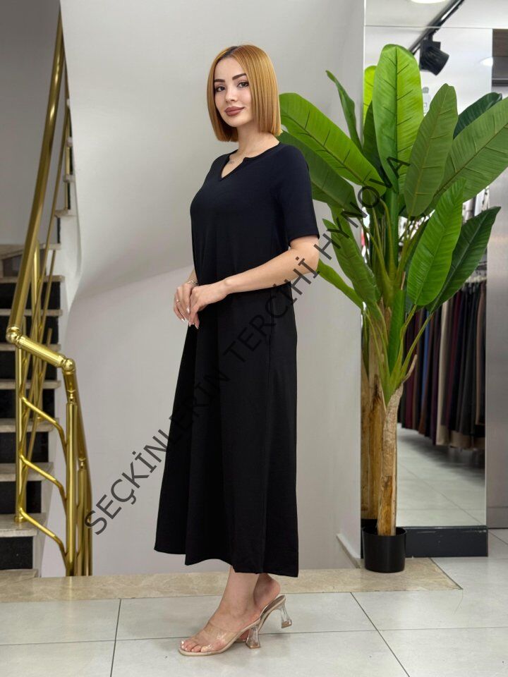Kadın Kısa Kollu V Yakalı Cep Detaylı Uzun Janjan Krep Elbise