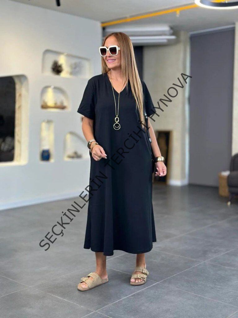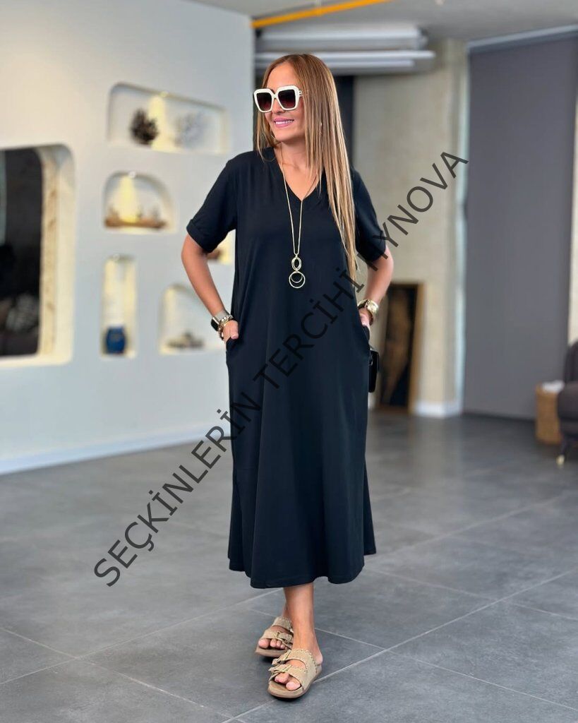 Kadın Kısa Kollu V Yakalı Cep Detaylı Uzun Viskon Iki Iplik Elbise