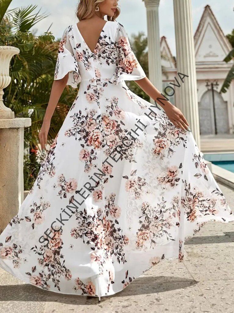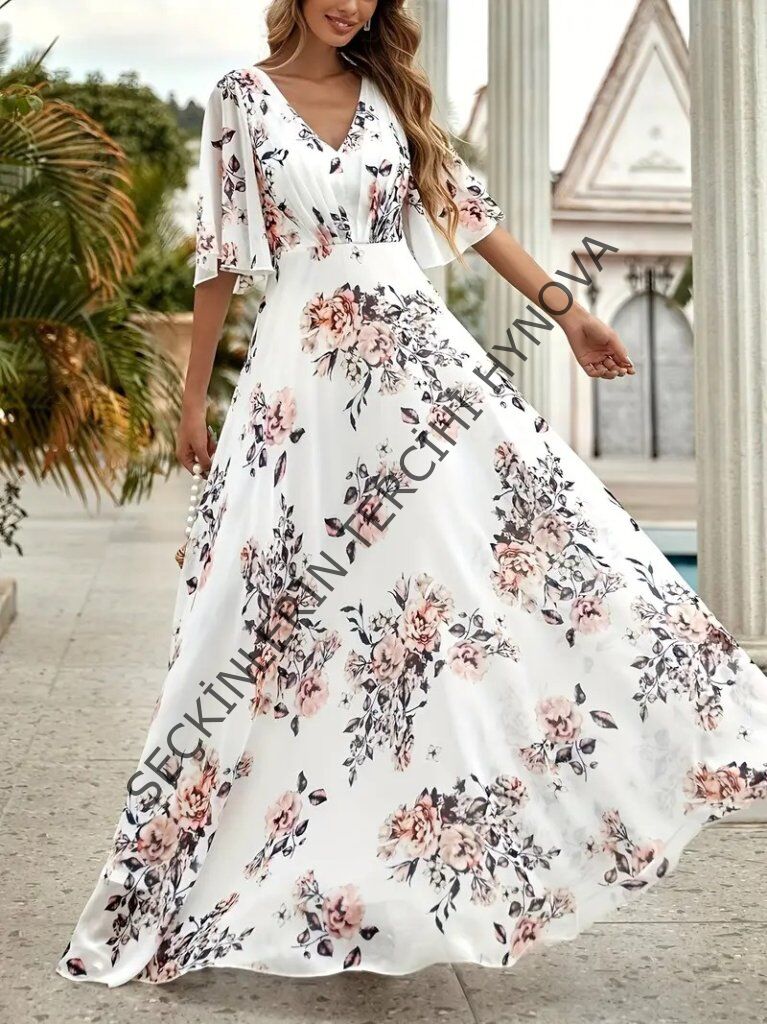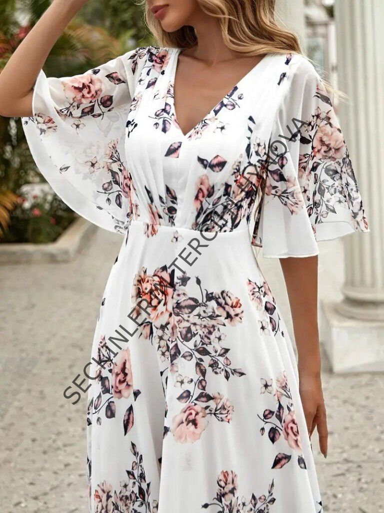 Kadın Kısa Kollu V Yakalı çiçek Desenli Süprem Elbise
