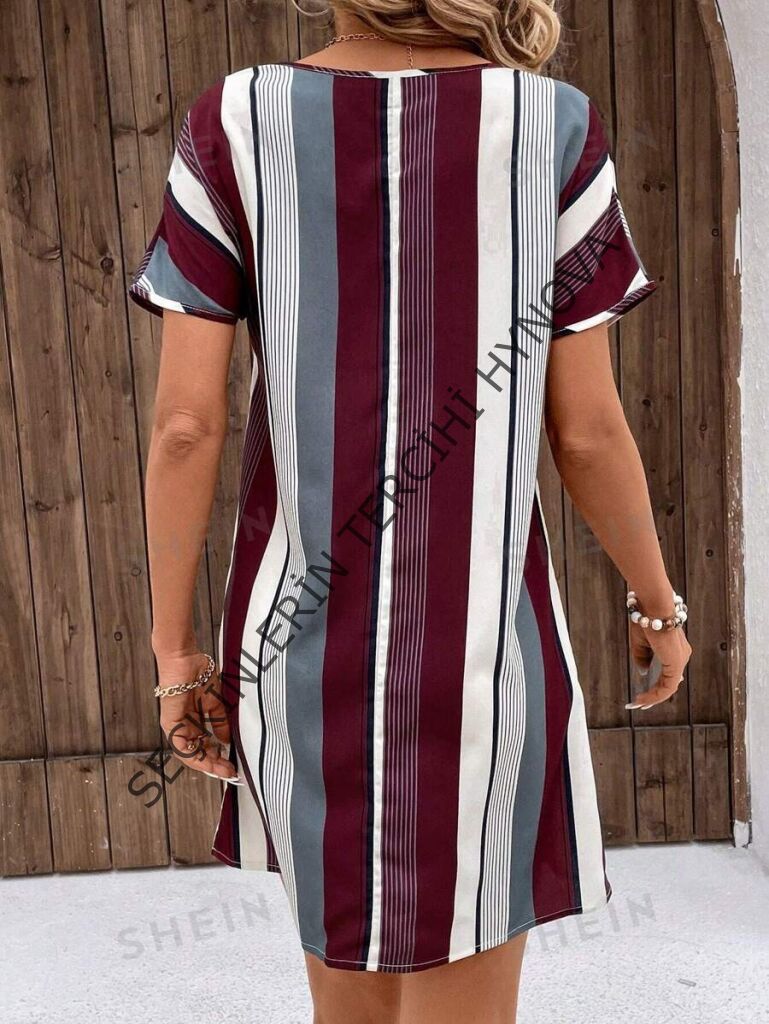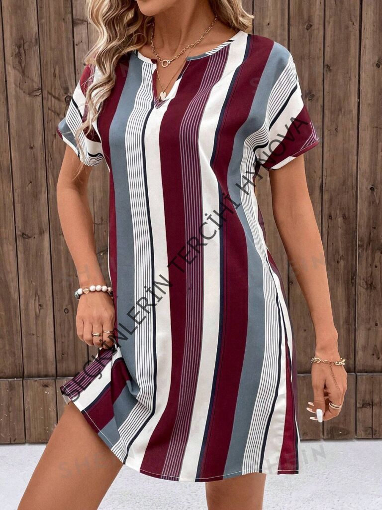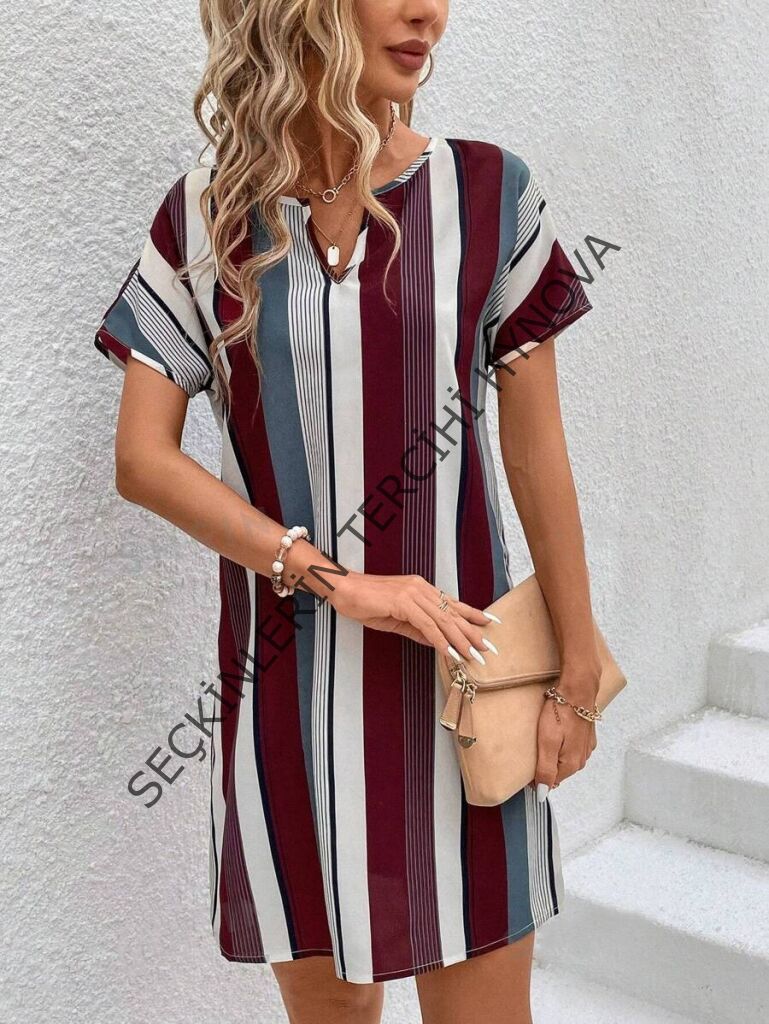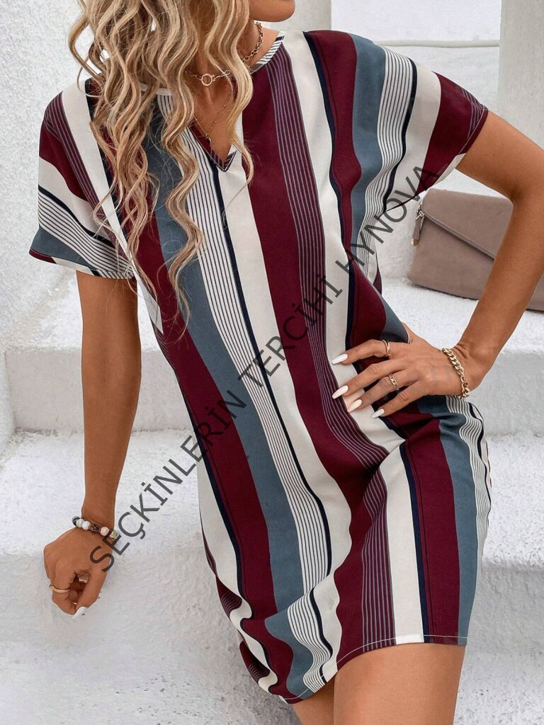Kadın Kısa Kollu V Yakalı çizgi Baskılı Süprem Elbise
