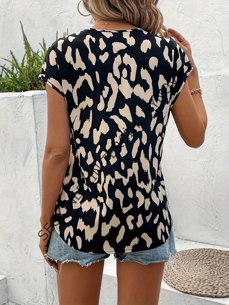 Kadın Kısa Kollu V Yakalı Desenli Süprem Bluz
