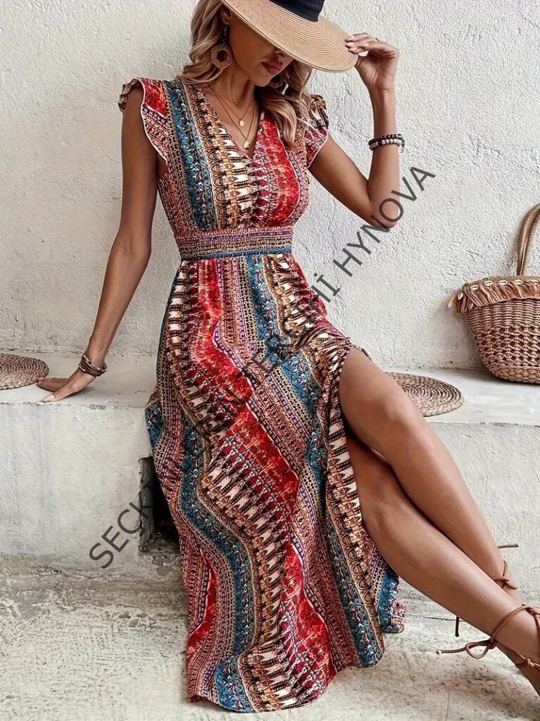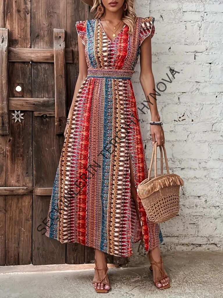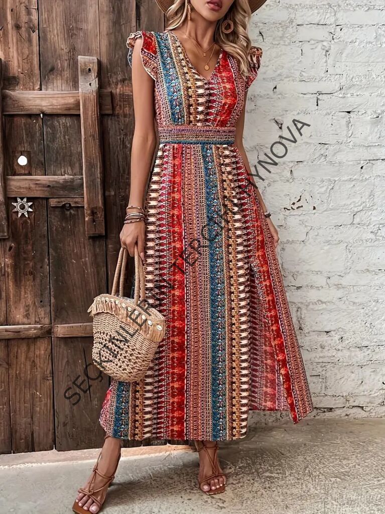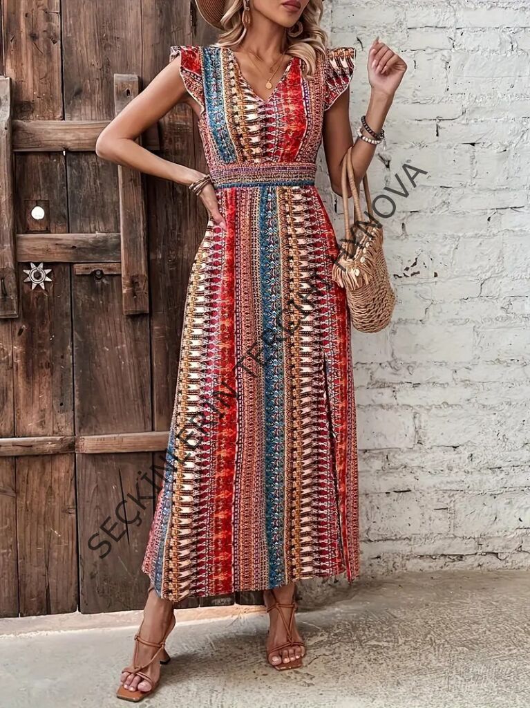 Kadın Kısa Kollu V Yakalı Desenli Yandan Yırtmaçlı Süprem Elbise