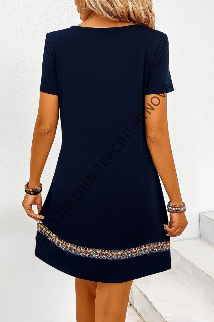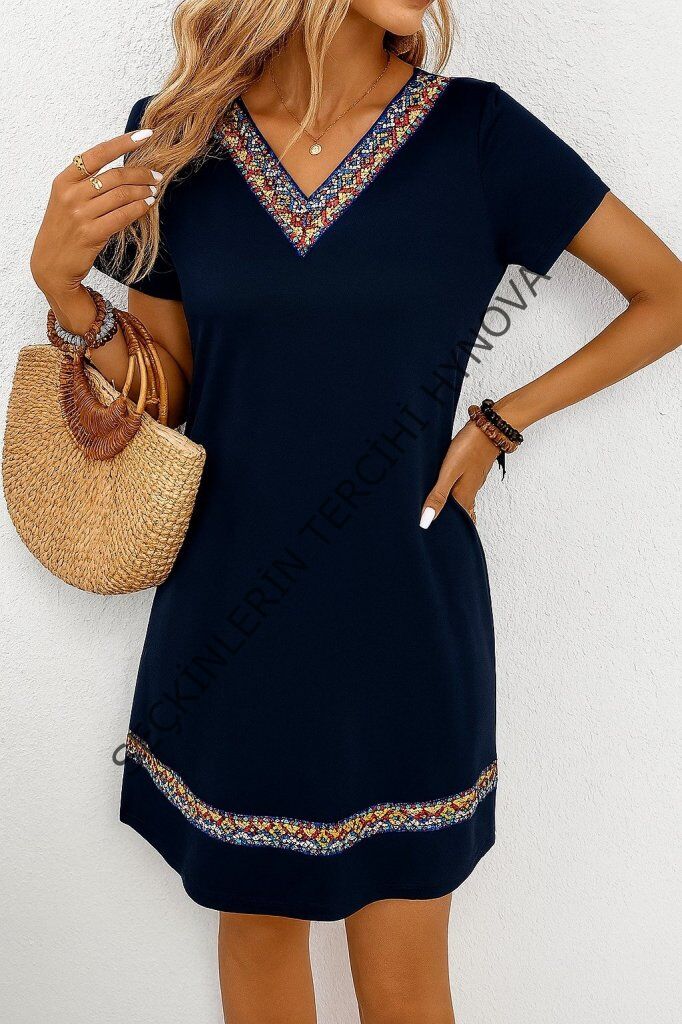 Kadın Kısa Kollu V Yakalı Etnik Desen şerit Detaylı Viskon Elbise