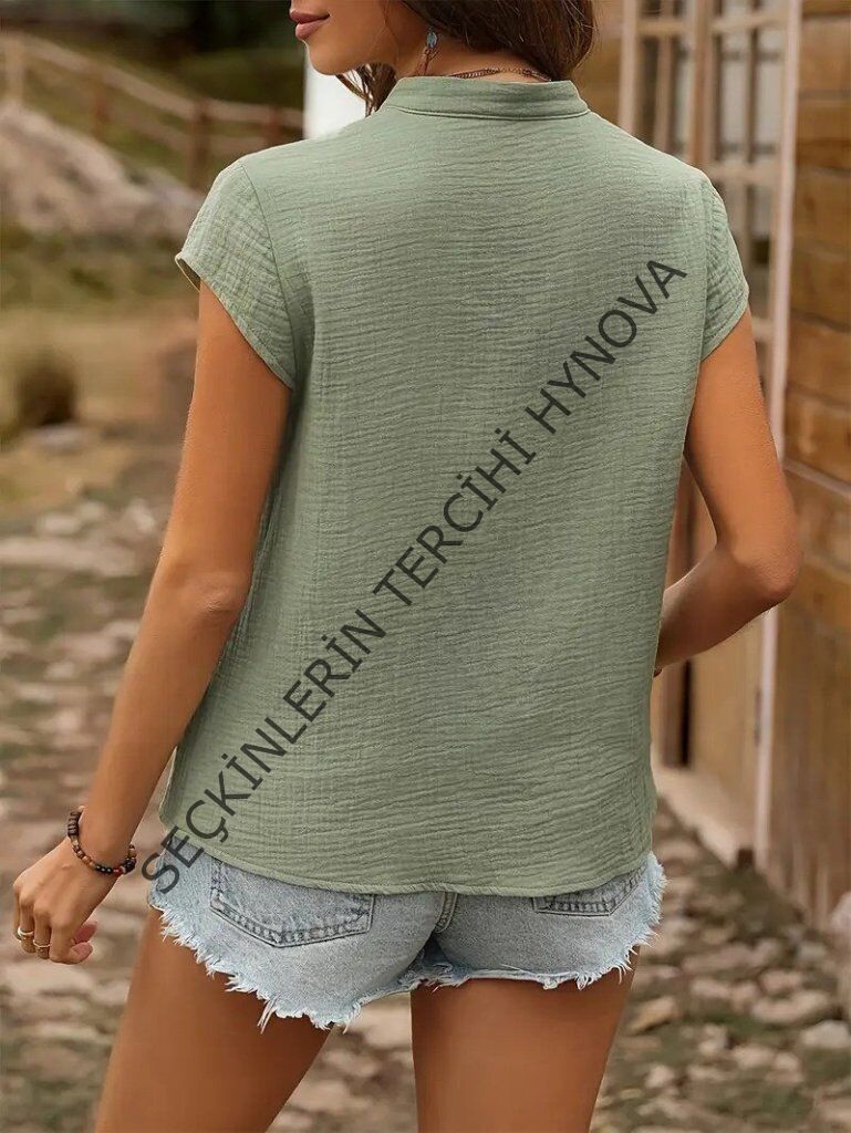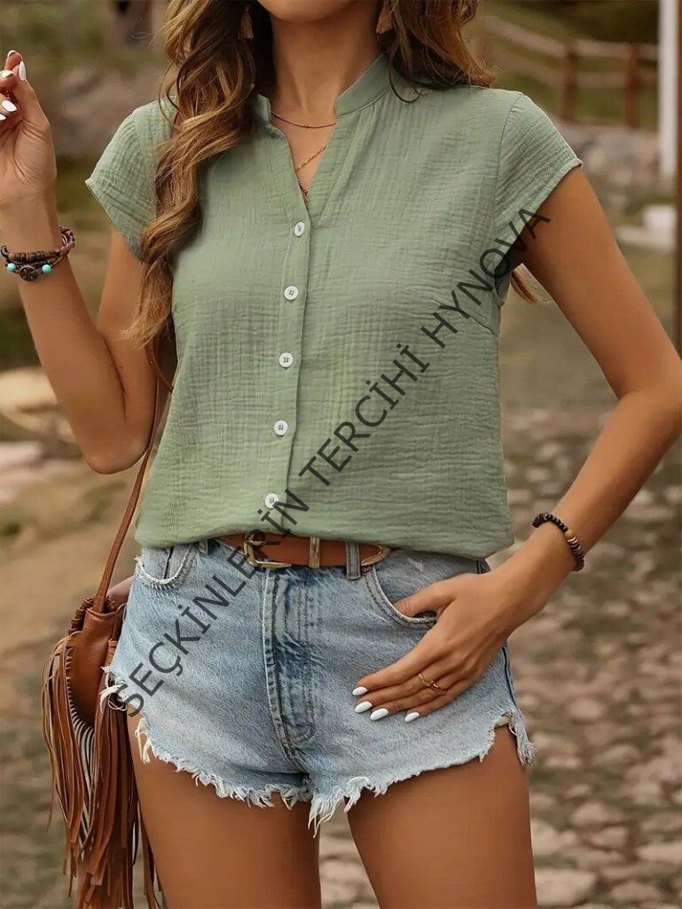 Kadın Kısa Kollu V Yakalı önden Düğmeli Müslim Gömlek
