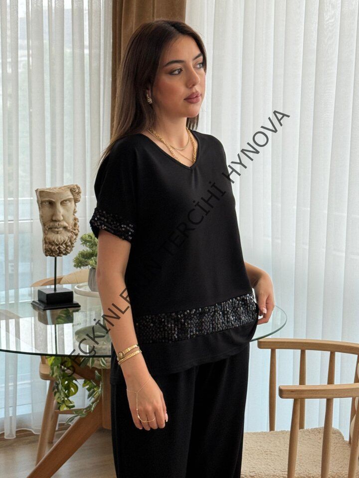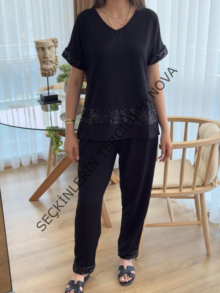 Kadın Kısa Kollu V Yakalı Pul Payetli Viskon Iki Iplik Bluz Ve Pantolon Ikili Takım