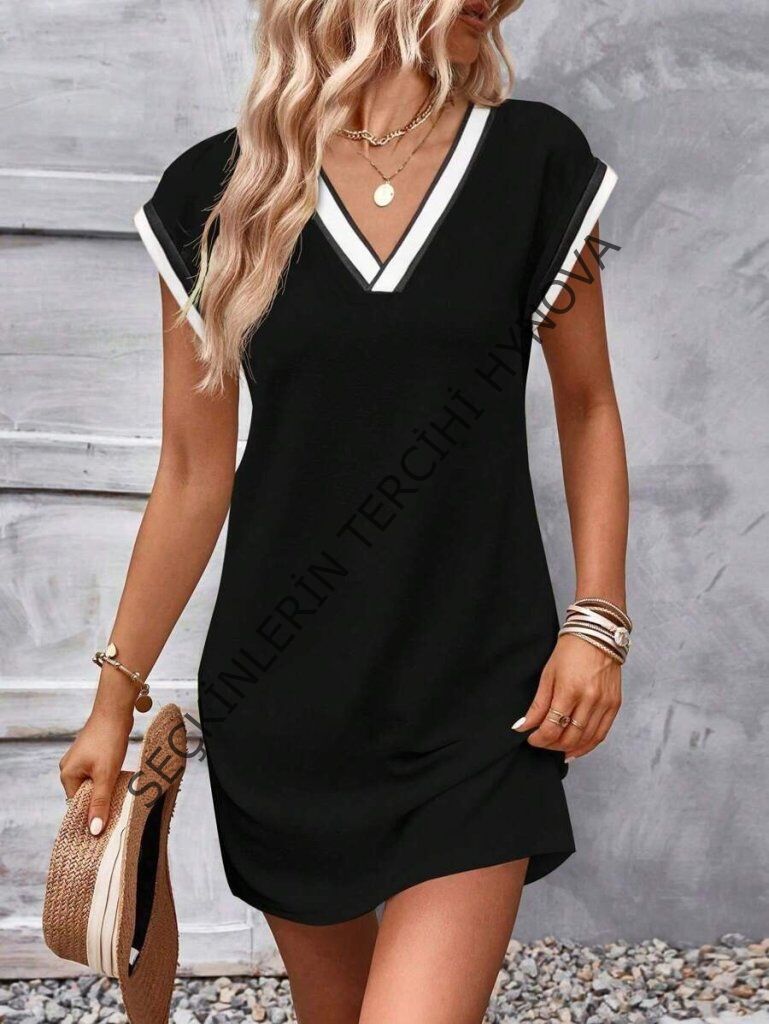 Kadın Kısa Kollu V Yakalı Ribanalı Modal Mini Elbise
