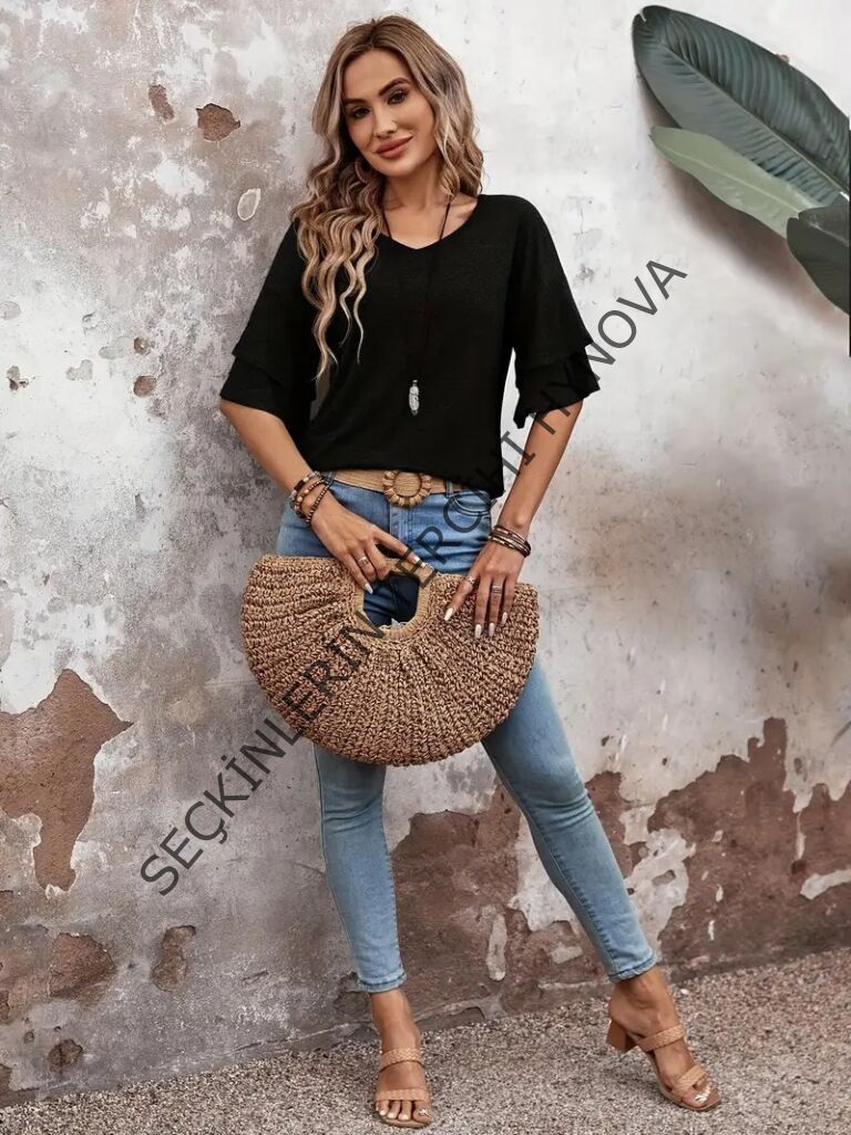 Kadın Kısa Kollu V Yakalı Viskon Bluz