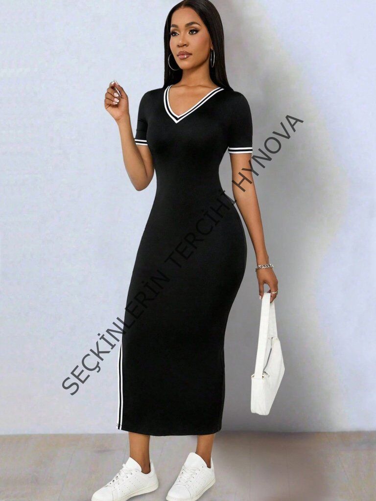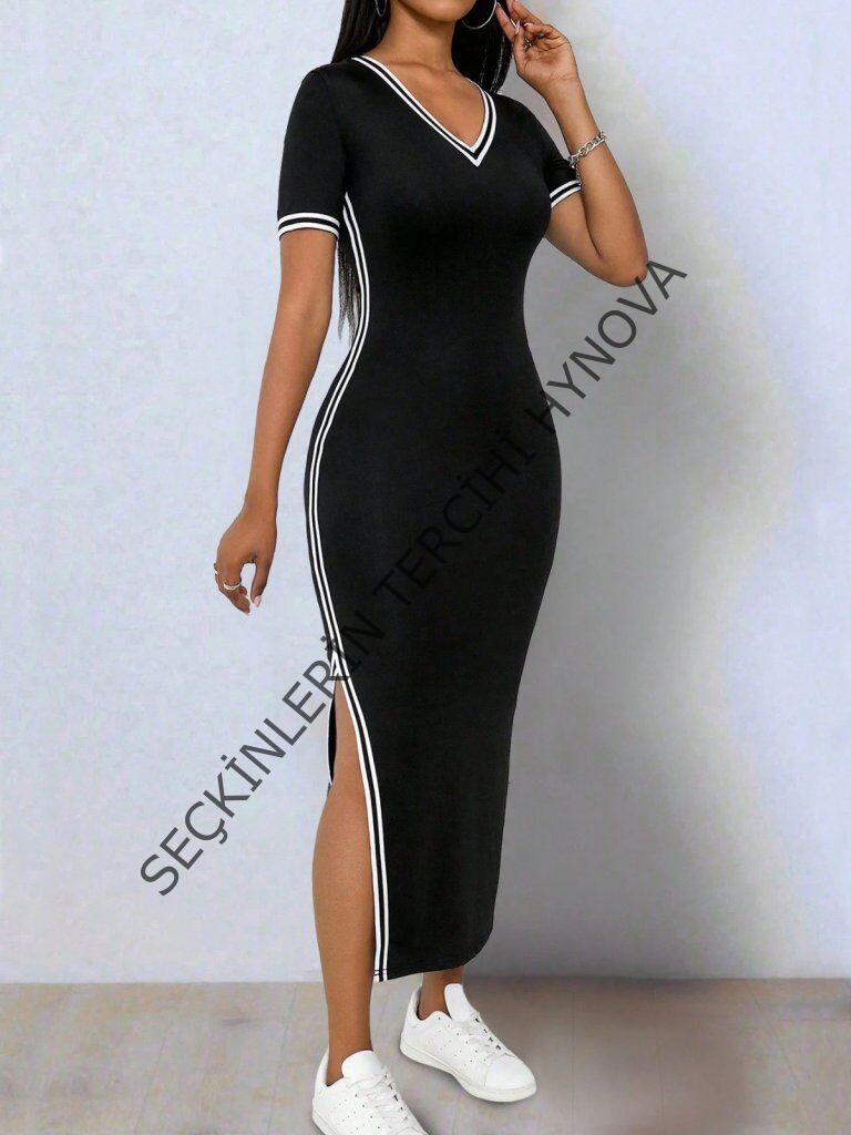Kadın Kısa Kollu V Yakalı Yandan Yırtmaçlı Viskon Iki Iplik Elbise