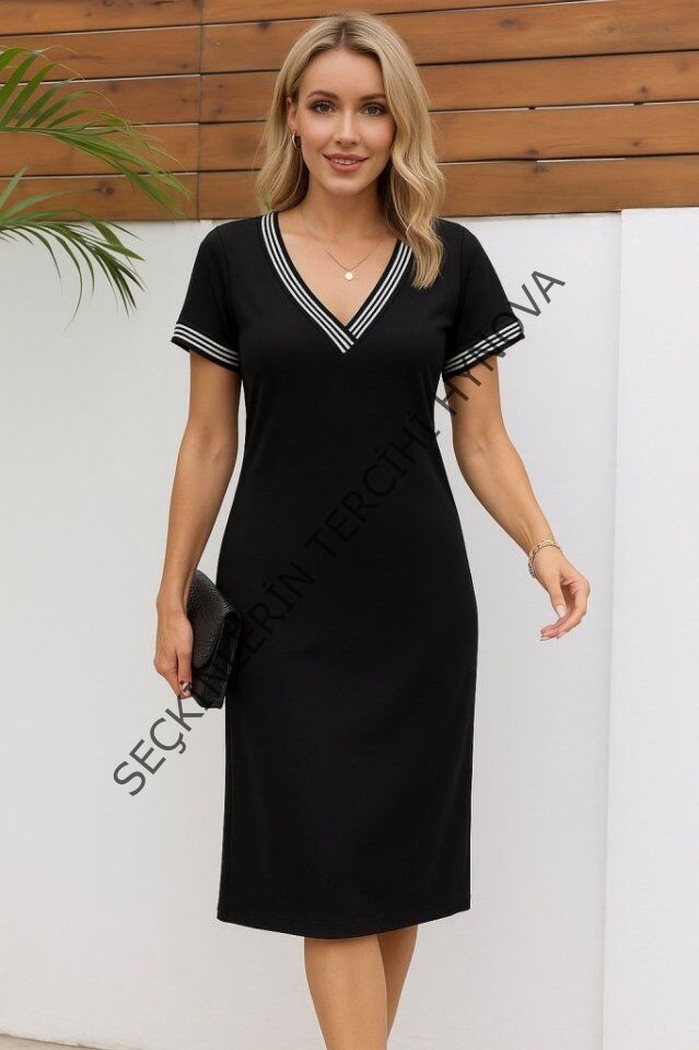 Kadın Kısa Kollu V Yakalı Yanlardan Yırtmaç Ve Düğmeli Viskon Iki Iplik Elbise